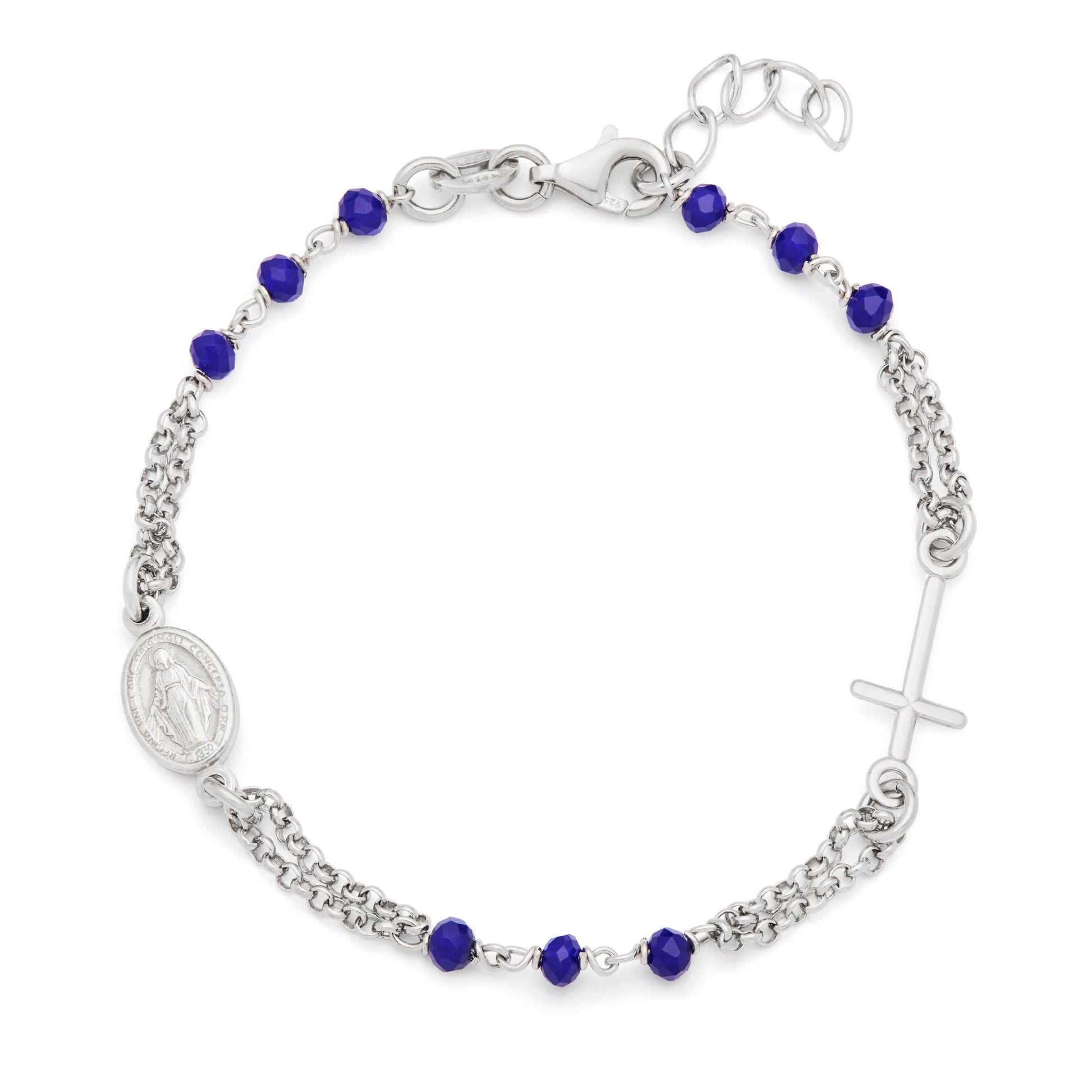 Sterling Silver Double Strand Bracelet with Blue Beads Featuring the Miraculous Medal and a Cross