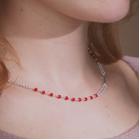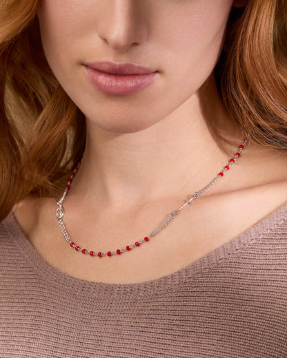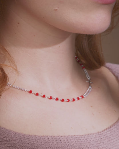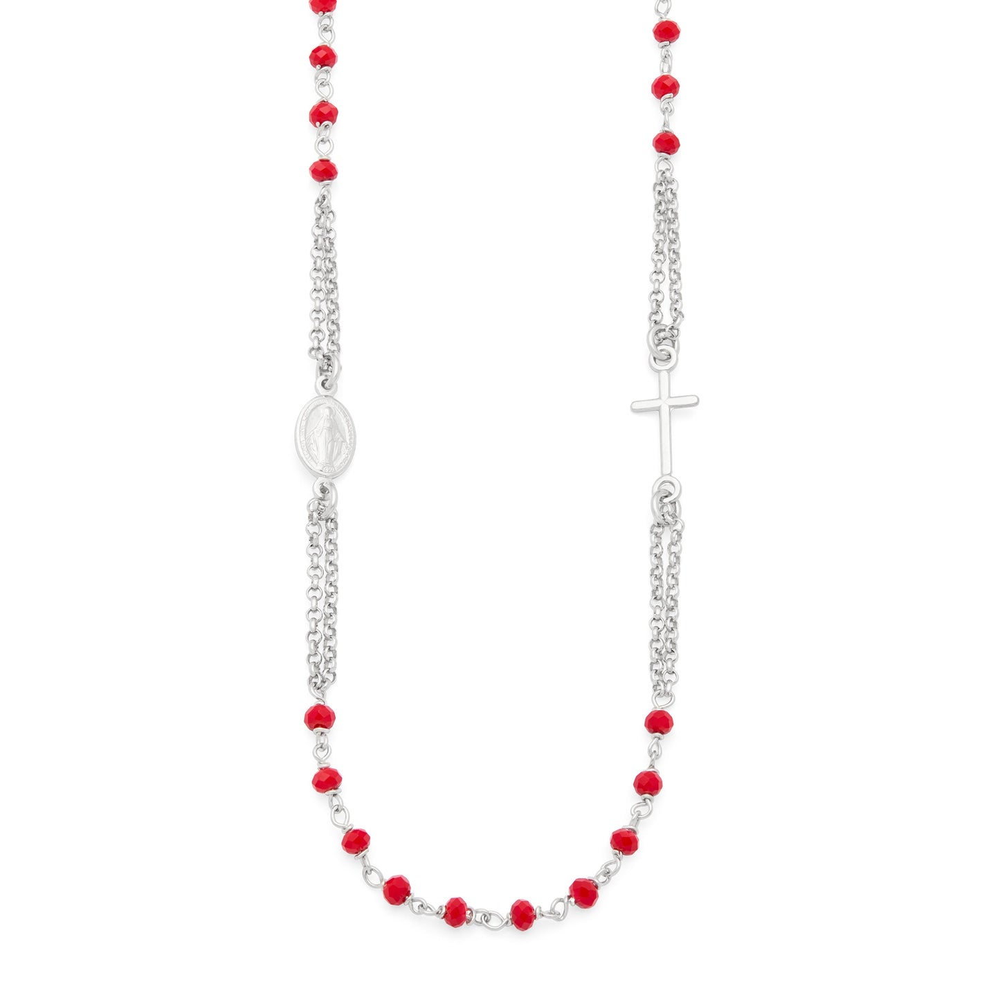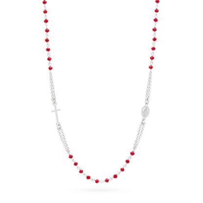This double-strand rosary necklace in sterling silver with red beads is truly significant. The red beads are not only visually appealing but also rich in symbolism. In Christian tradition, red is often associated with the Passion of Christ and the blood shed in martyrdom by Him and the saints. This color represents sacrifice and divine love, making the rosary not only a beautiful piece but also one of deep spirituality.