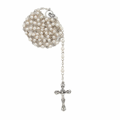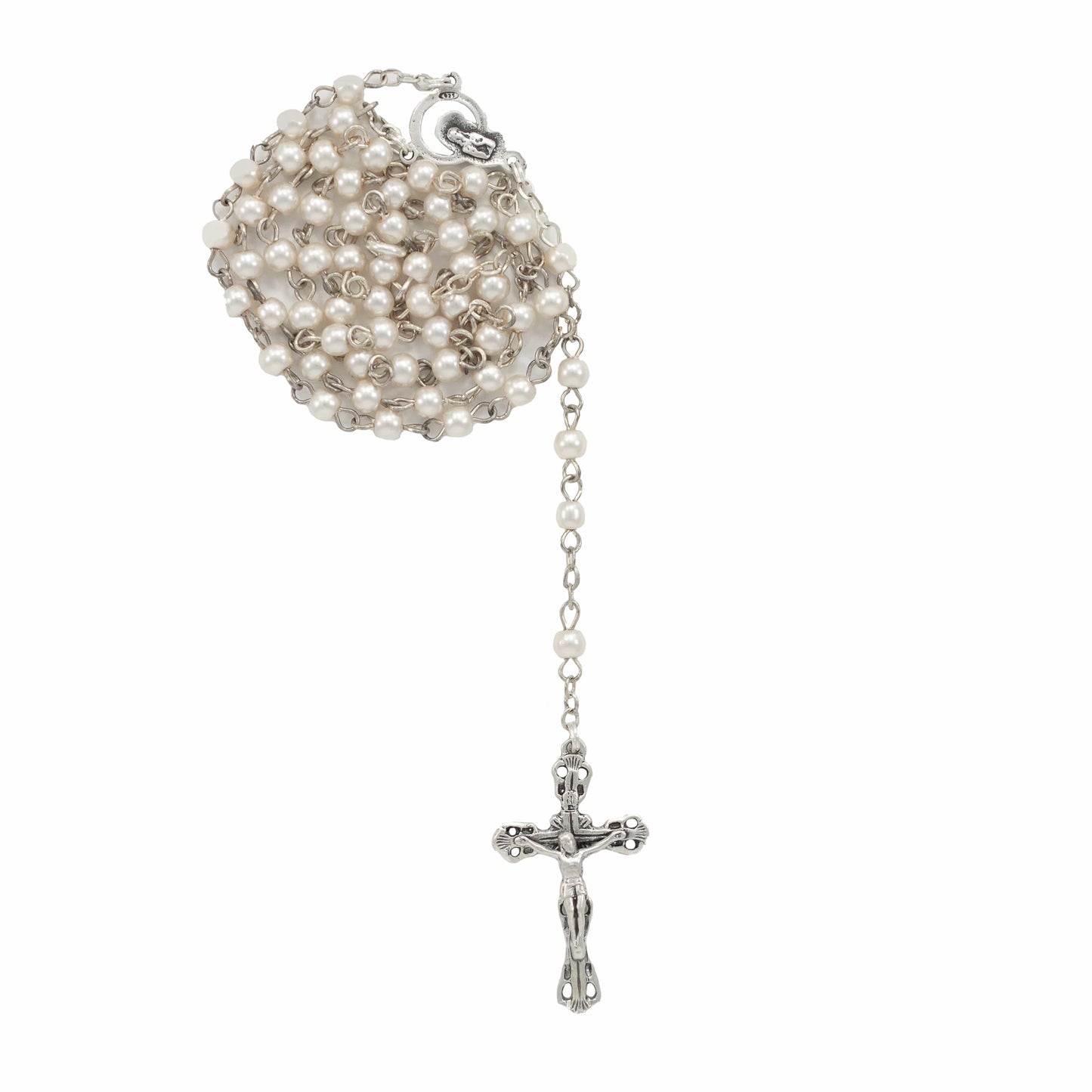 Round beads in white fresh water pearl and sterling silver binding. In Matthew’s Gospel, the pearl is linked to the Kingdom of Heaven, it is pure and without imperfections. The central medal depicts Mother Mary, Rosary ends with simple sterling silver Cross with Body.