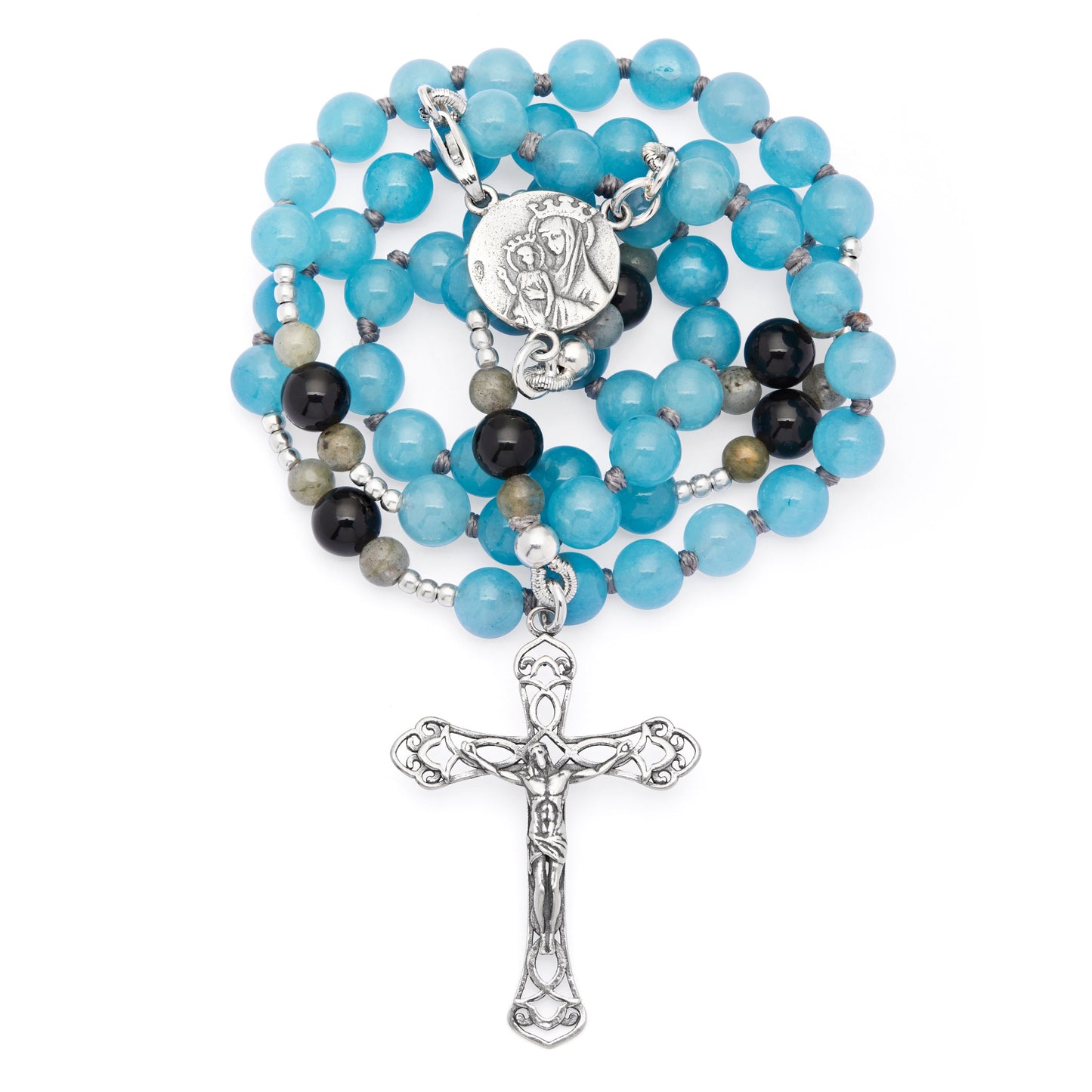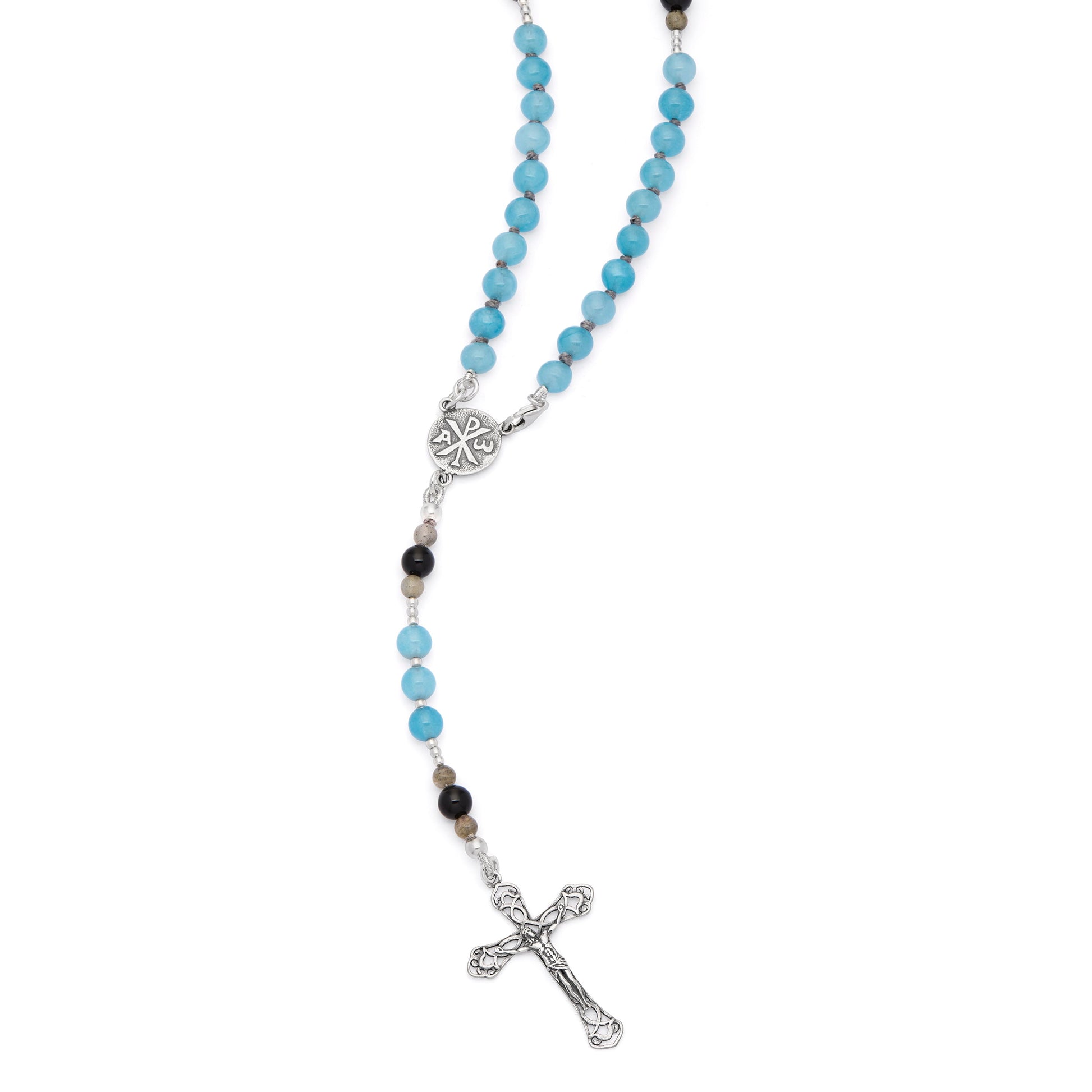 A rosary that embodies peace, strength, and intuition, crafted with angelite, onyx, and labradorite. Angelite, with its celestial blue hue, inspires serenity and spiritual connection, evoking the protection of the Virgin Mary. Onyx, deep and intense, represents stability and courage, helping to stay grounded in faith even in difficult times. Labradorite, with its iridescent reflections, symbolizes mystery and inner light, encouraging reflection and spiritual growth. In the mystery beads, onyx and labradorite guide prayer with balance and depth. The cross and centerpiece in 925 sterling silver add sacredness, with the centerpiece featuring the Cross of Peace and Mater Ecclesiae. The eternal cord binding ensures strength and durability, making this rosary an indestructible prayer companion, bringing peace and inner strength to those who hold it.