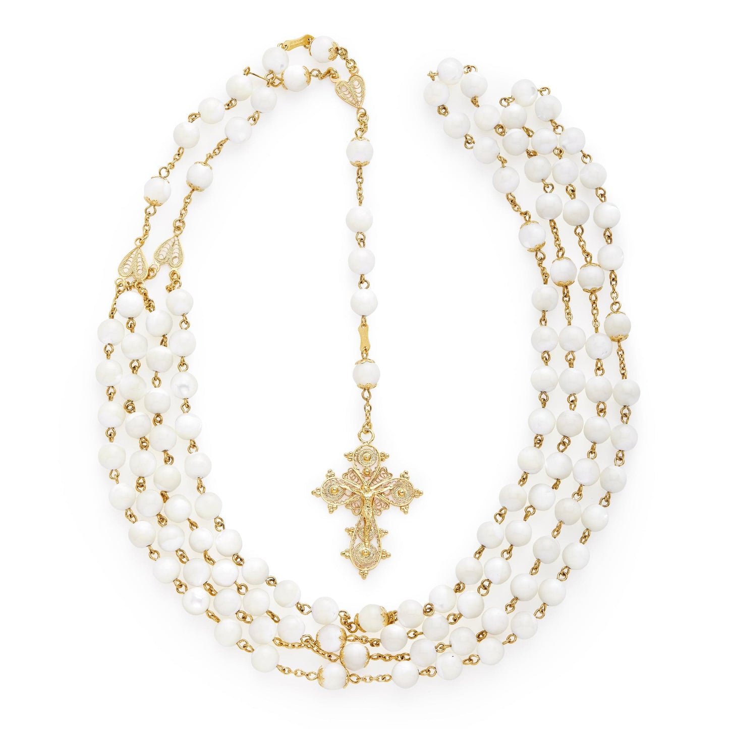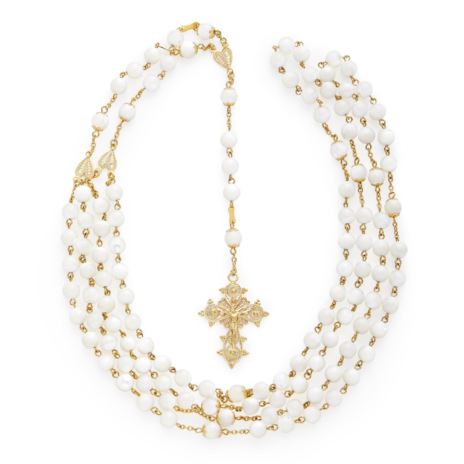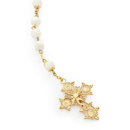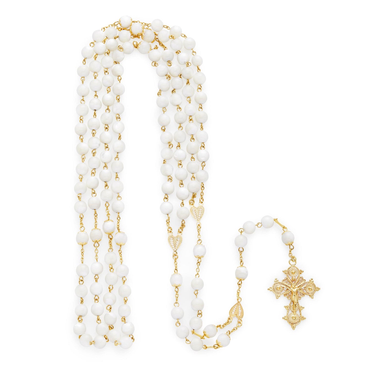 Gold plated sterling silver wedding rosary with 8mm round mother of pearl beads decorated with filigree caps. Two loops rosaries joined by a little heart filigree centerpiece in sterling silver plated in gold. A beautiful filigree crucifix closes the rosary. This amazing Rosary is known with the name of Lazo. Rooted in Mexico, the Wedding lasso continues to be an institution in many ceremonies. The lasso is placed over the couple's shoulder in the figure eight, which represents a new beginning in the Bible. Our lasso Rosary due to its small size is conceived to be kept in the hands of the couple. Its length is approximately 67 cm.