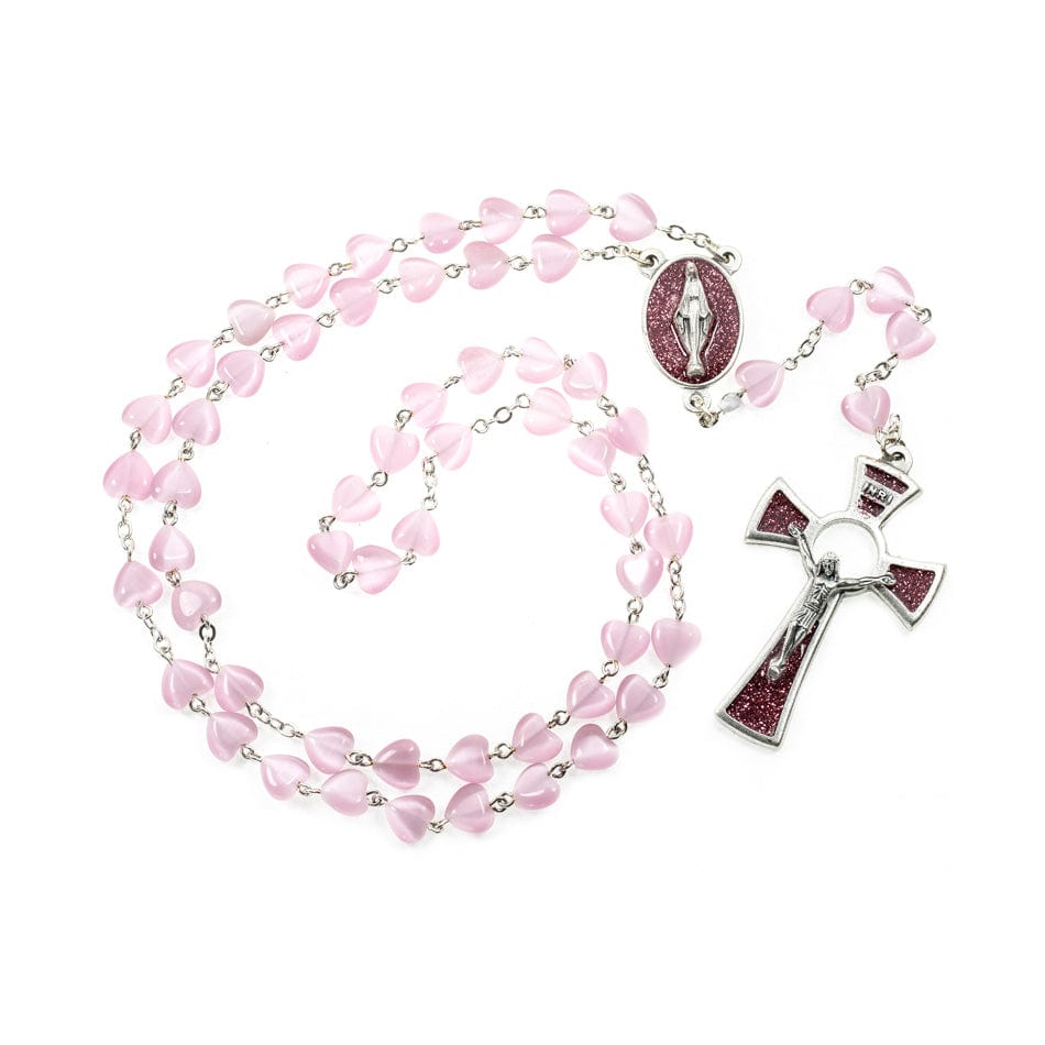 Pink Cat's Eyes Stone Rosary Small Hearts Beads