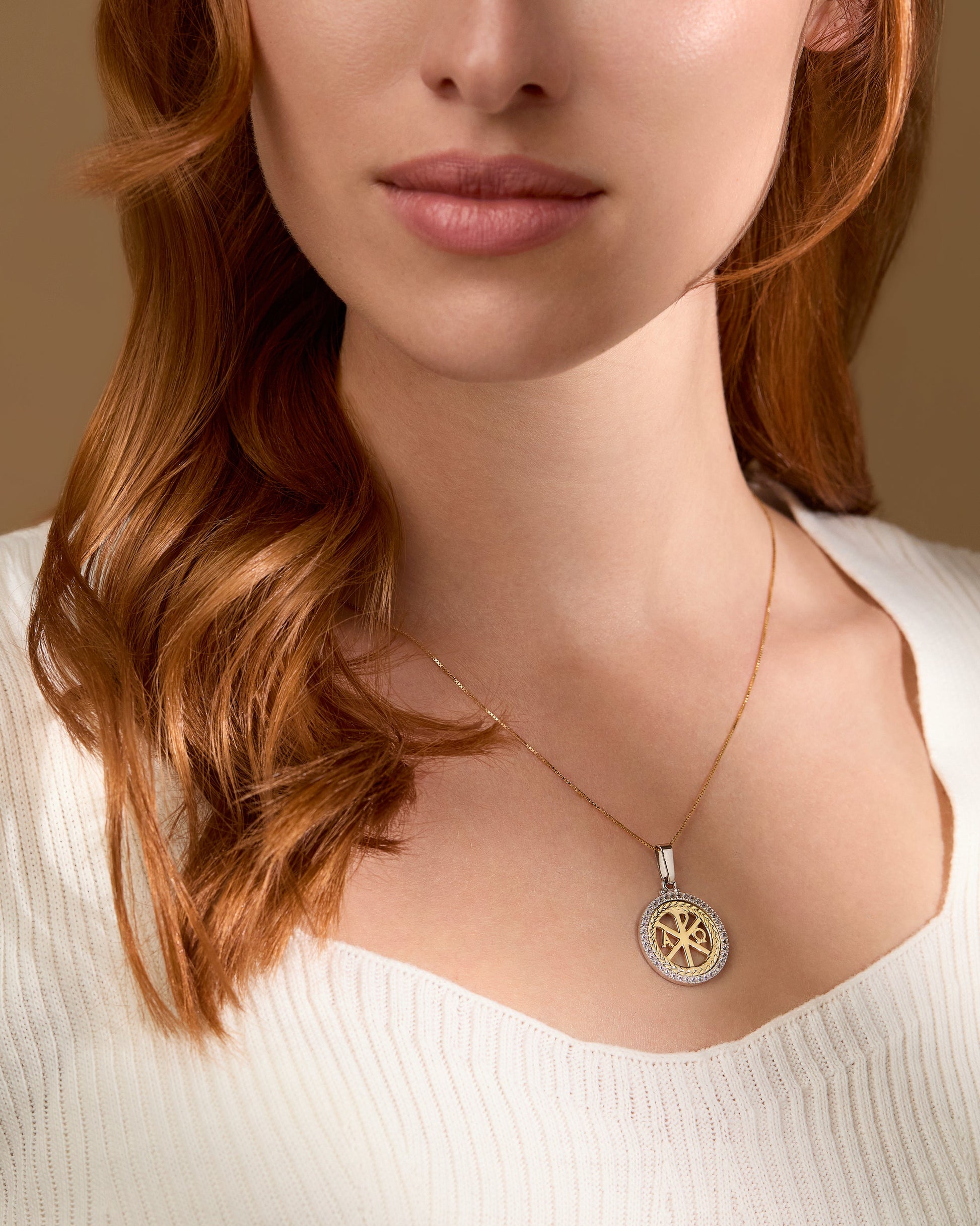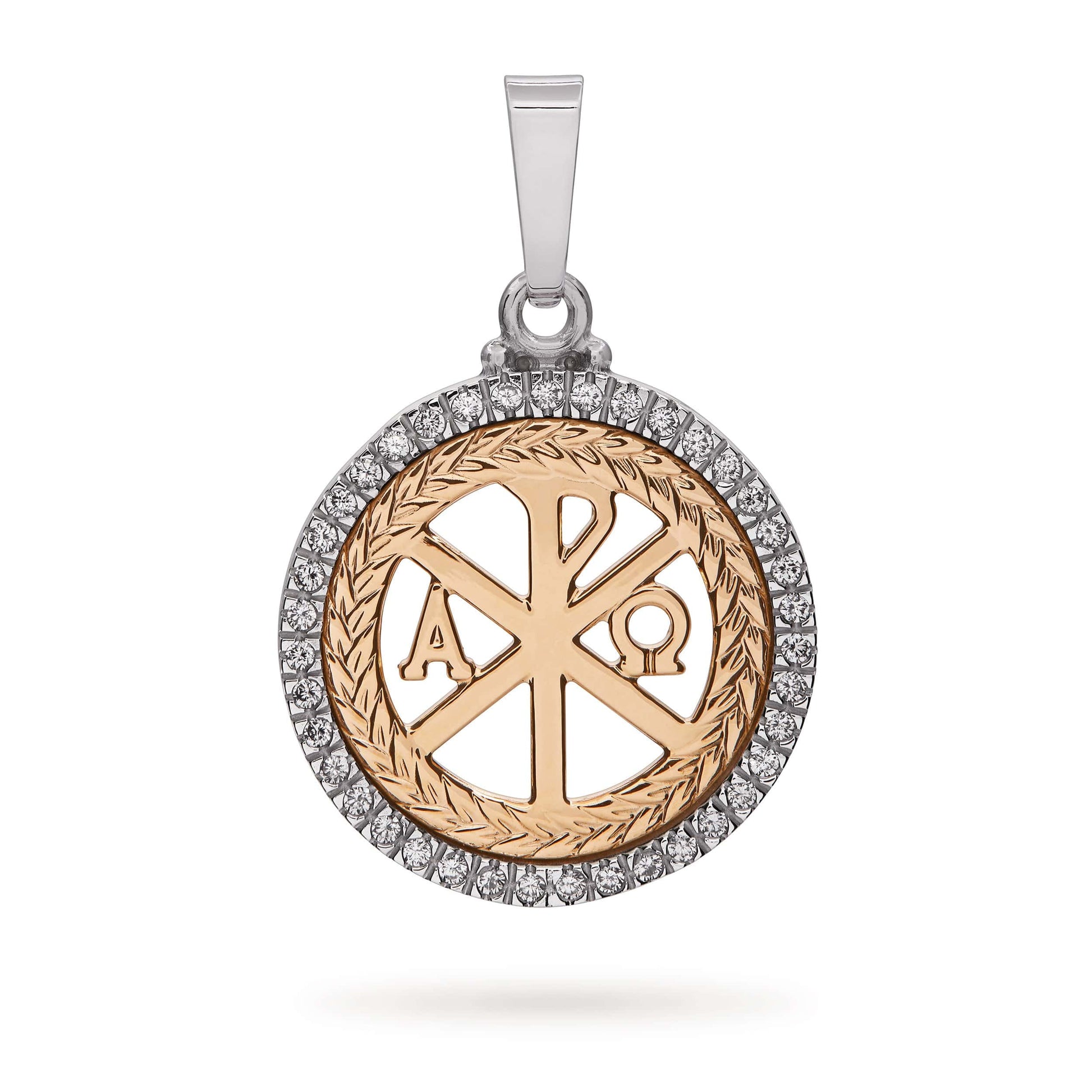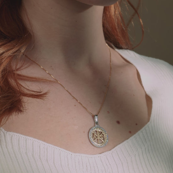 Crafted from a combination of shimmering white and yellow gold, this exquisite 18 kt peace cross boasts a border of premium zirconia crystals, measuring 23mm in diameter.