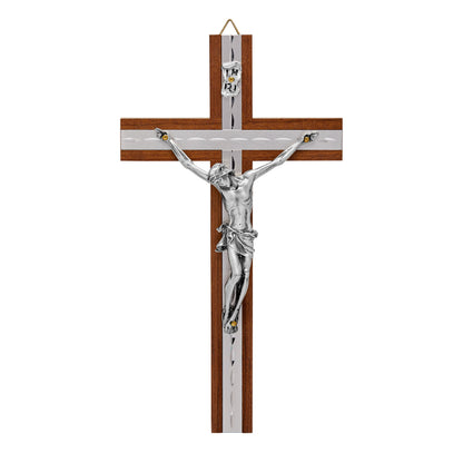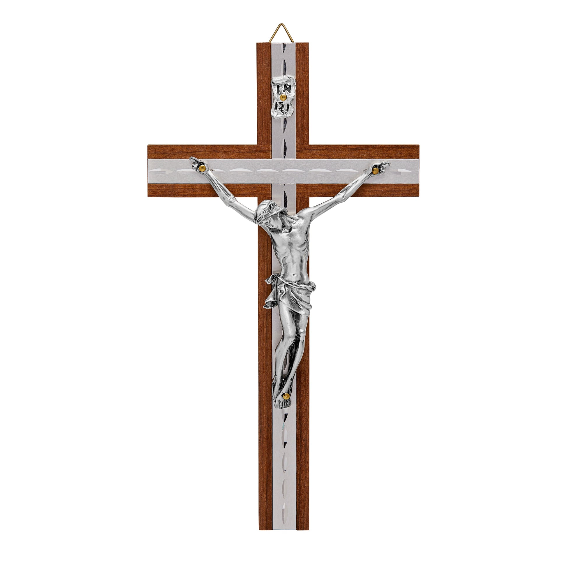 This walnut crucifix features timeless inlays and elegant silvered accents, making it a perfect addition to your home decor or a thoughtful devotional gift to a loved one.
