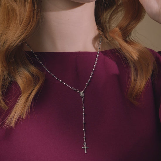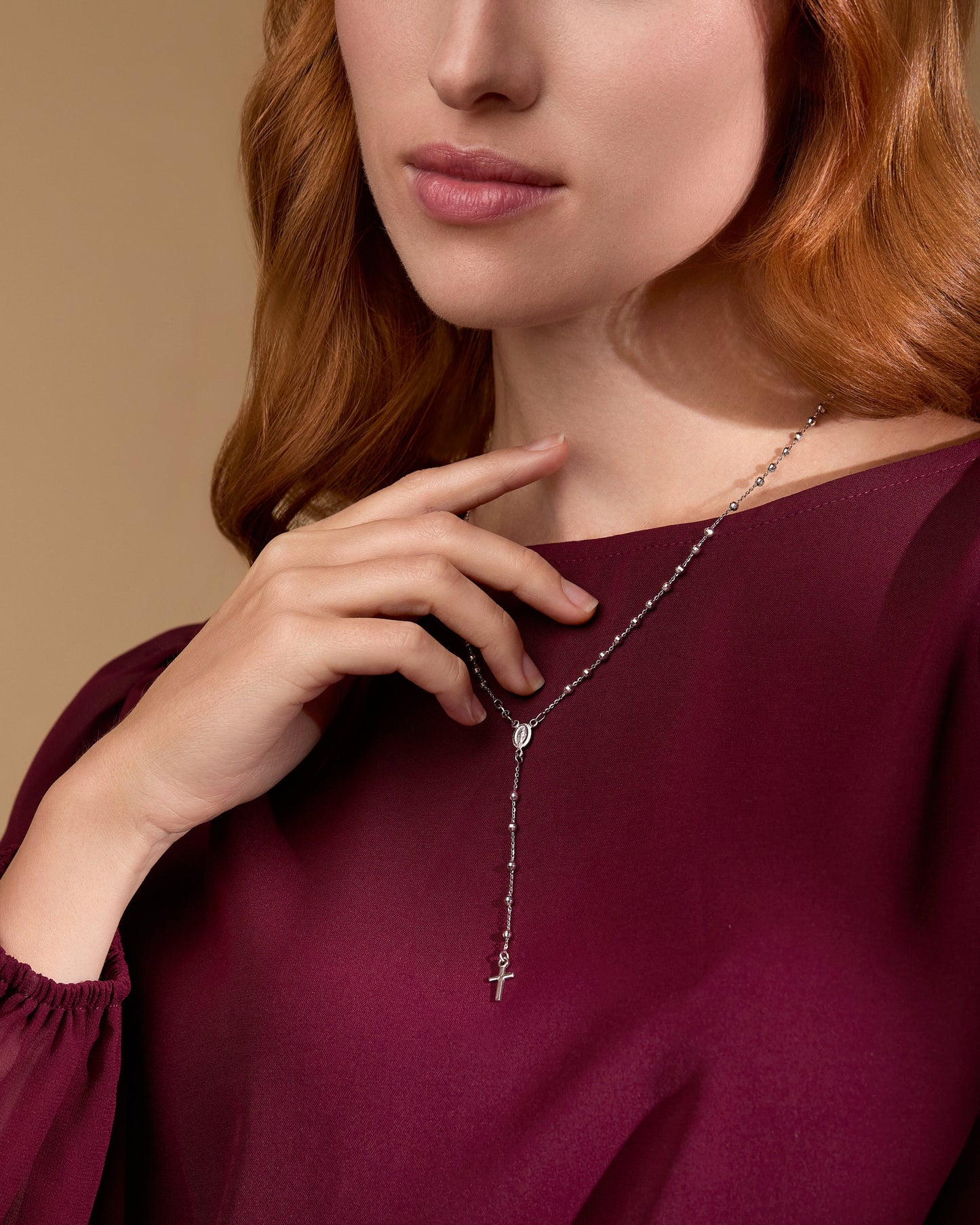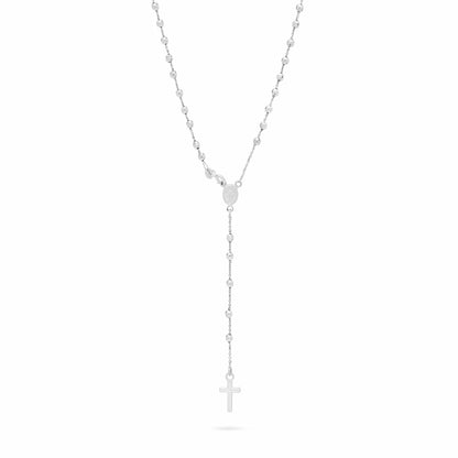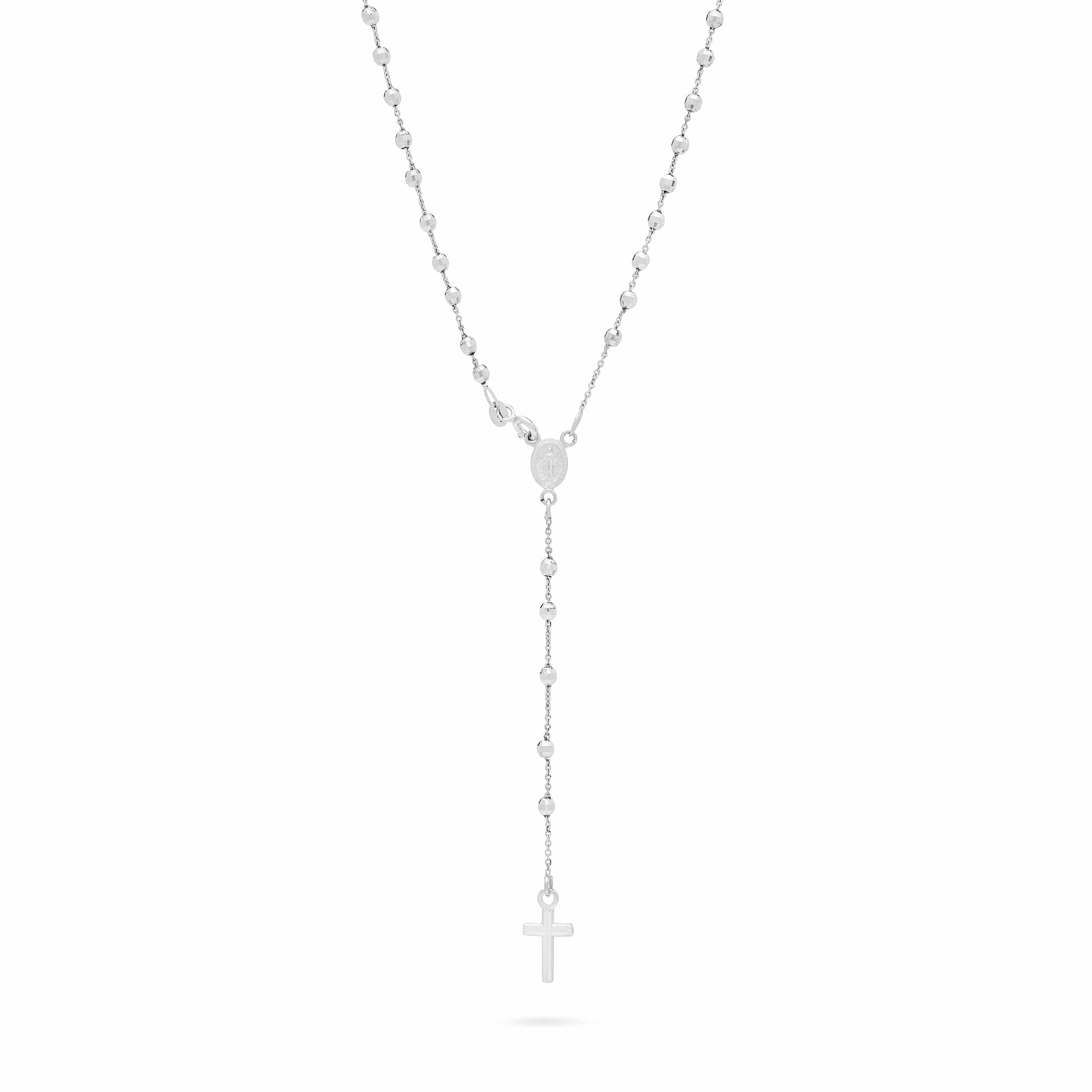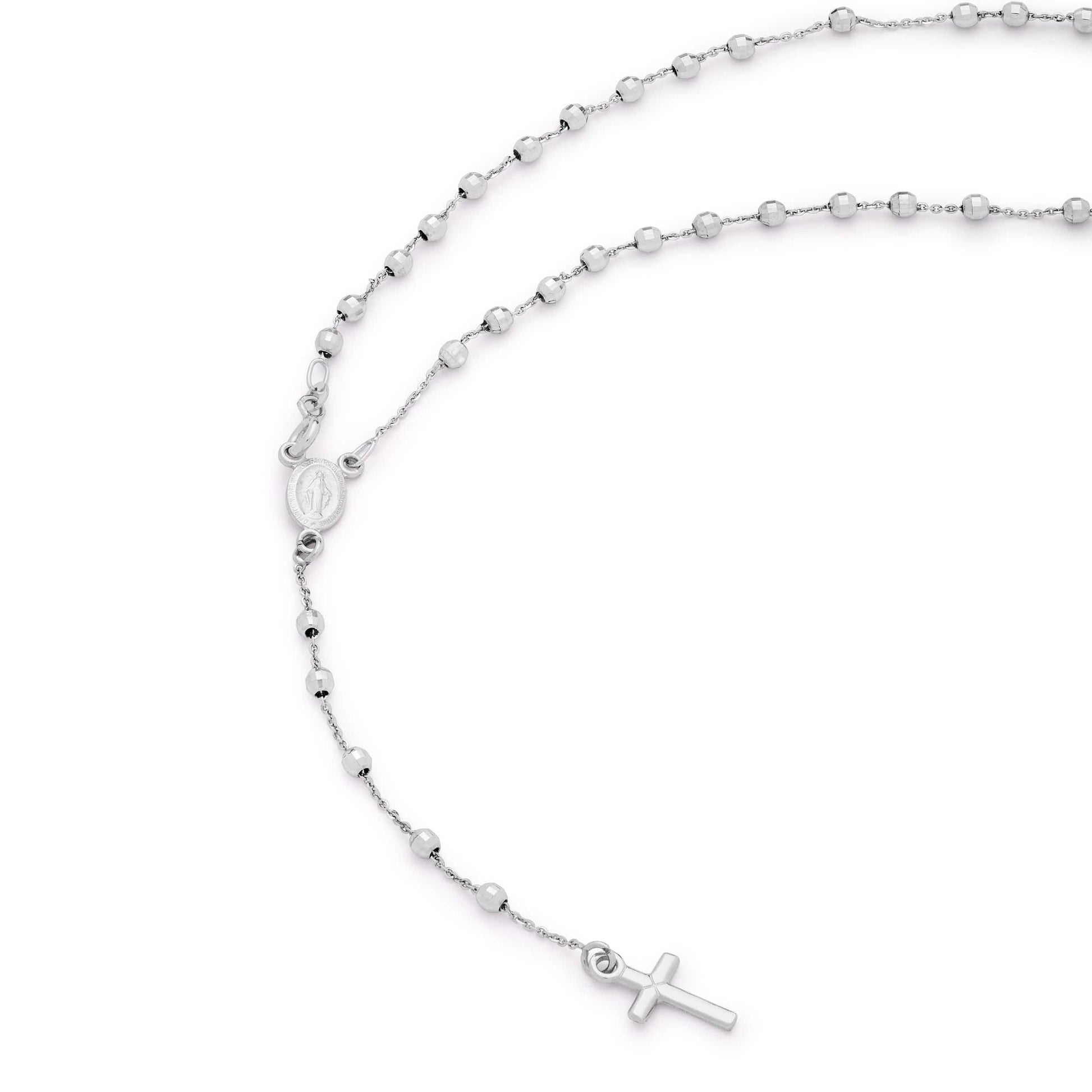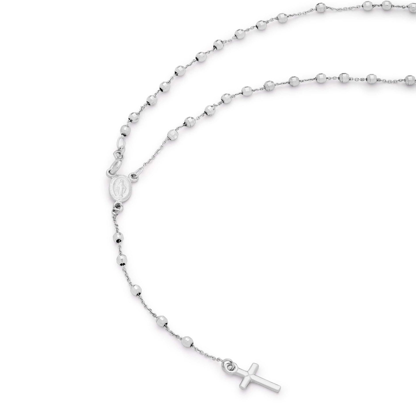 18kt White Gold Faceted Rosary Beads with the central Medal depicting Our Lady of Miracles and simple Cross. This necklace fastens with a lobster clasp.The beads measure 3mm.