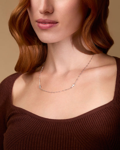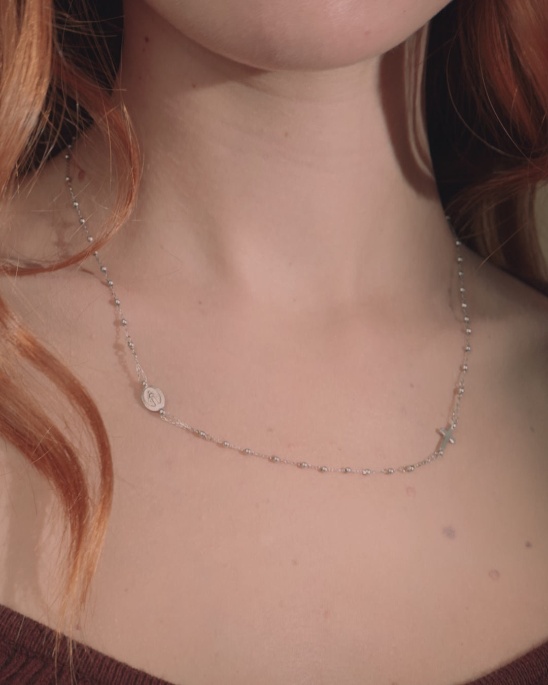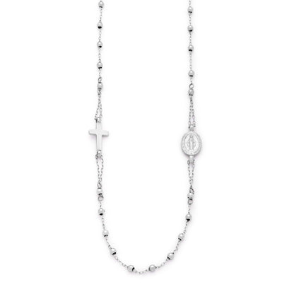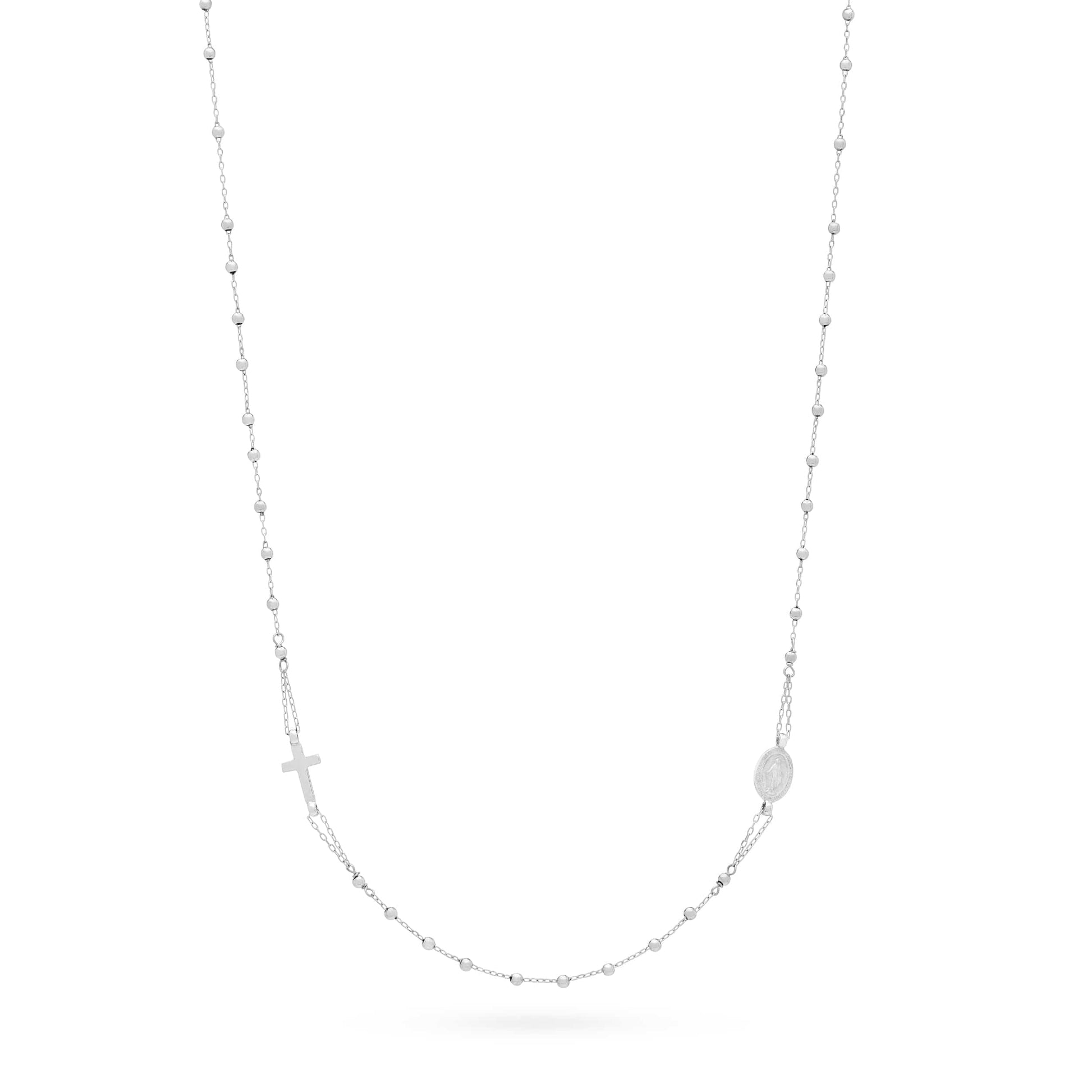 From our Faith Collection Rosary Beads Necklace made of solid 18kt White Gold with a Beautiful Miraculous Mary Medal and Simple Cross. 1mm round beads. Each rosary symbolises a prayer of protection, peace and Love.