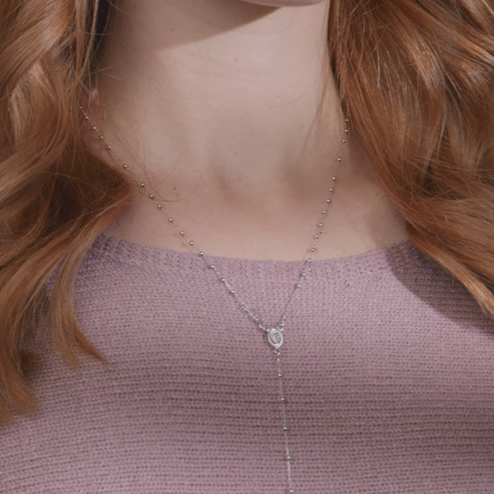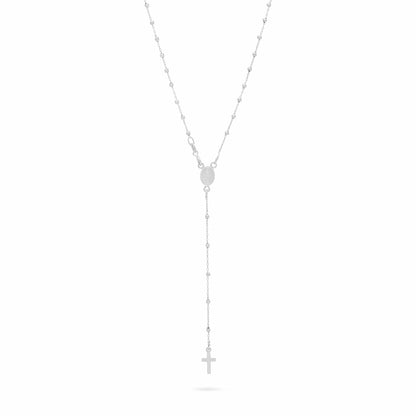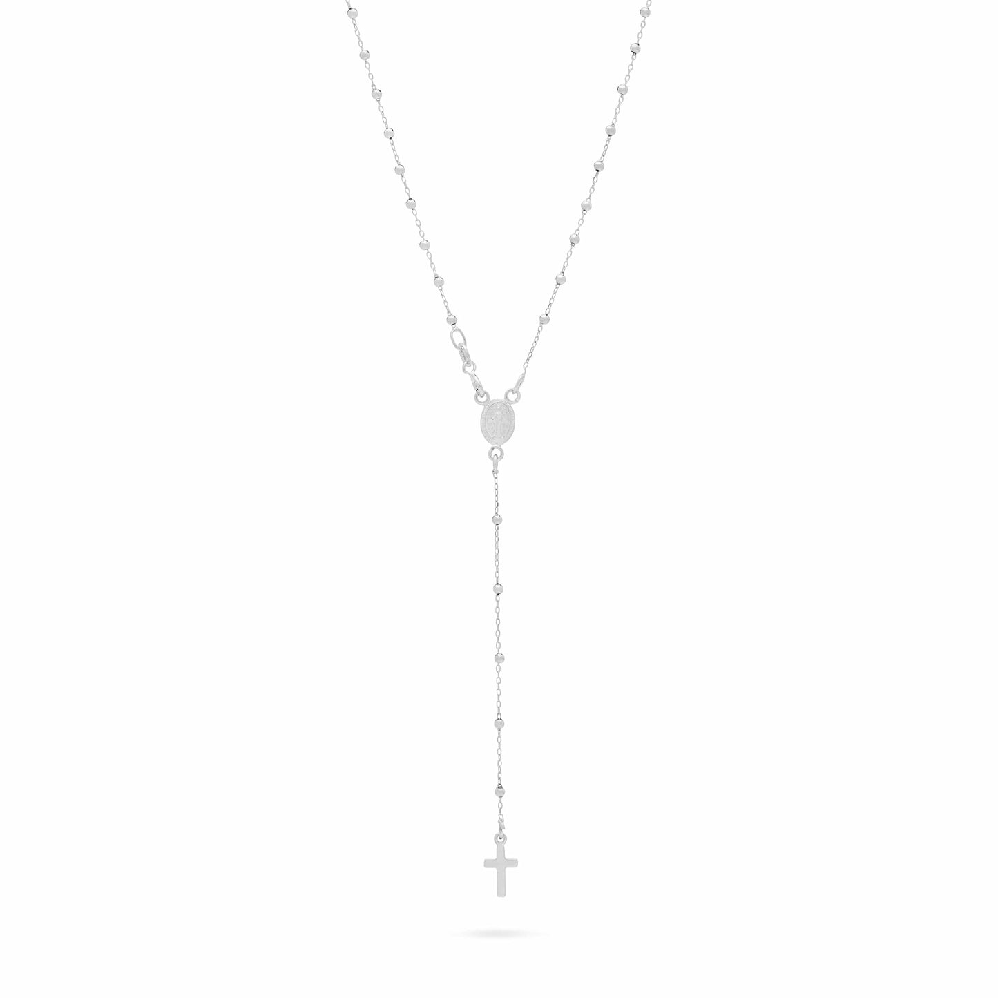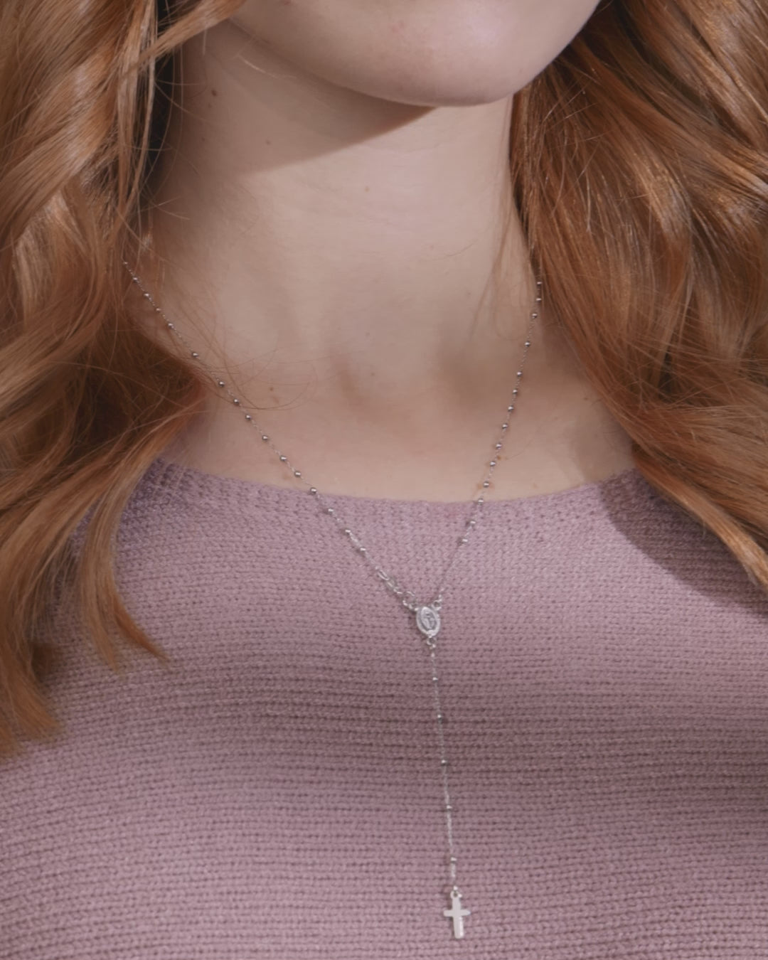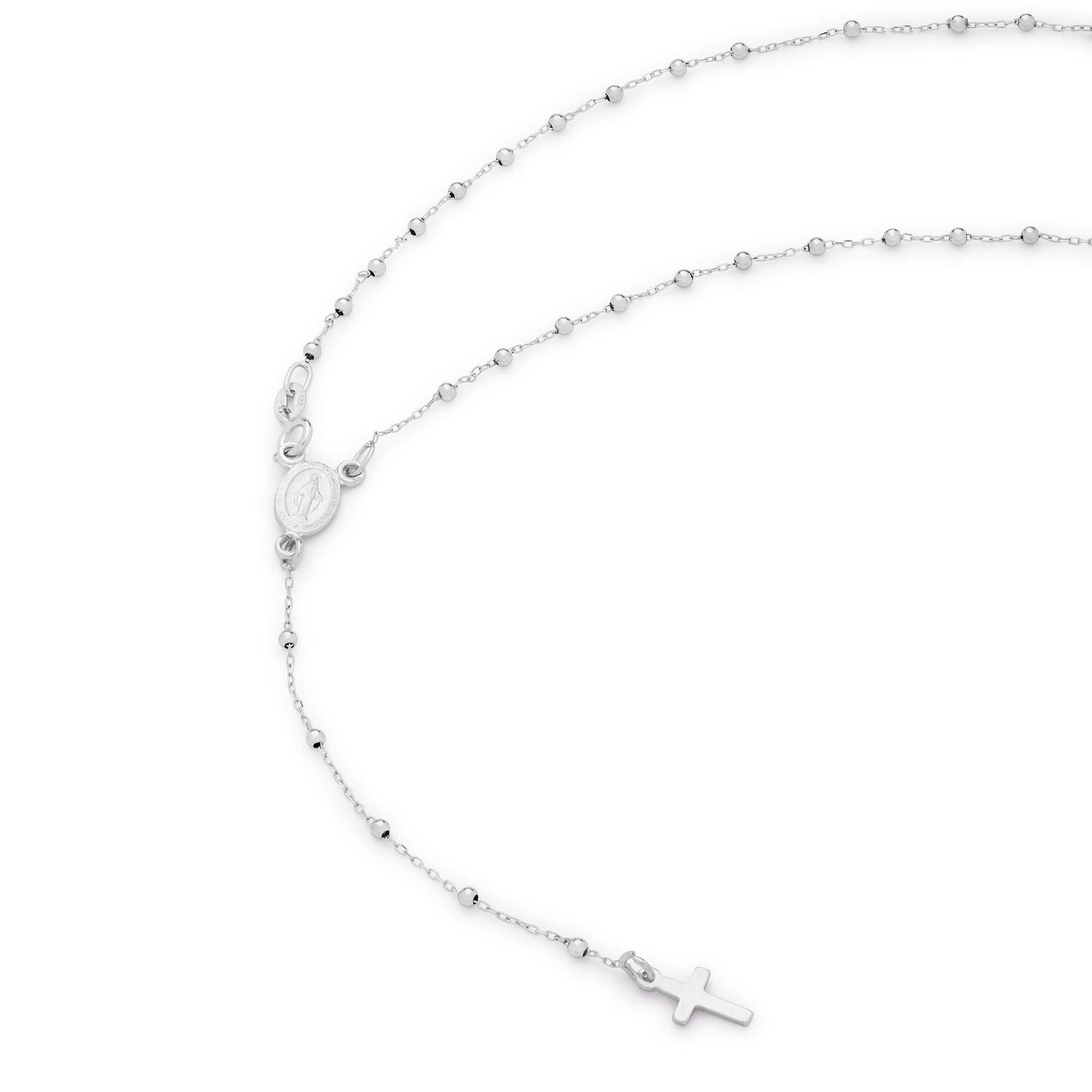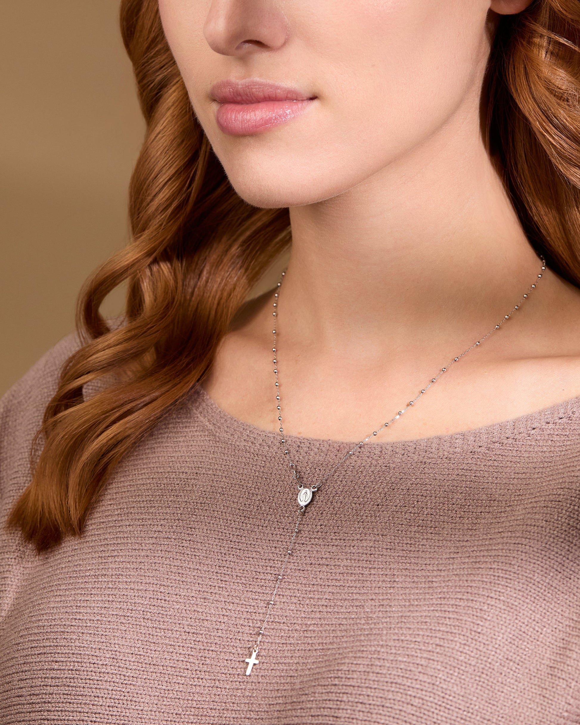 Precious tiny Rosary Beads entirely made in 18kt White Gold, with a central Miraculous Medal and simple Cross without Body. This necklace fastens a lobster clasp and beads measures estimated 1mm.