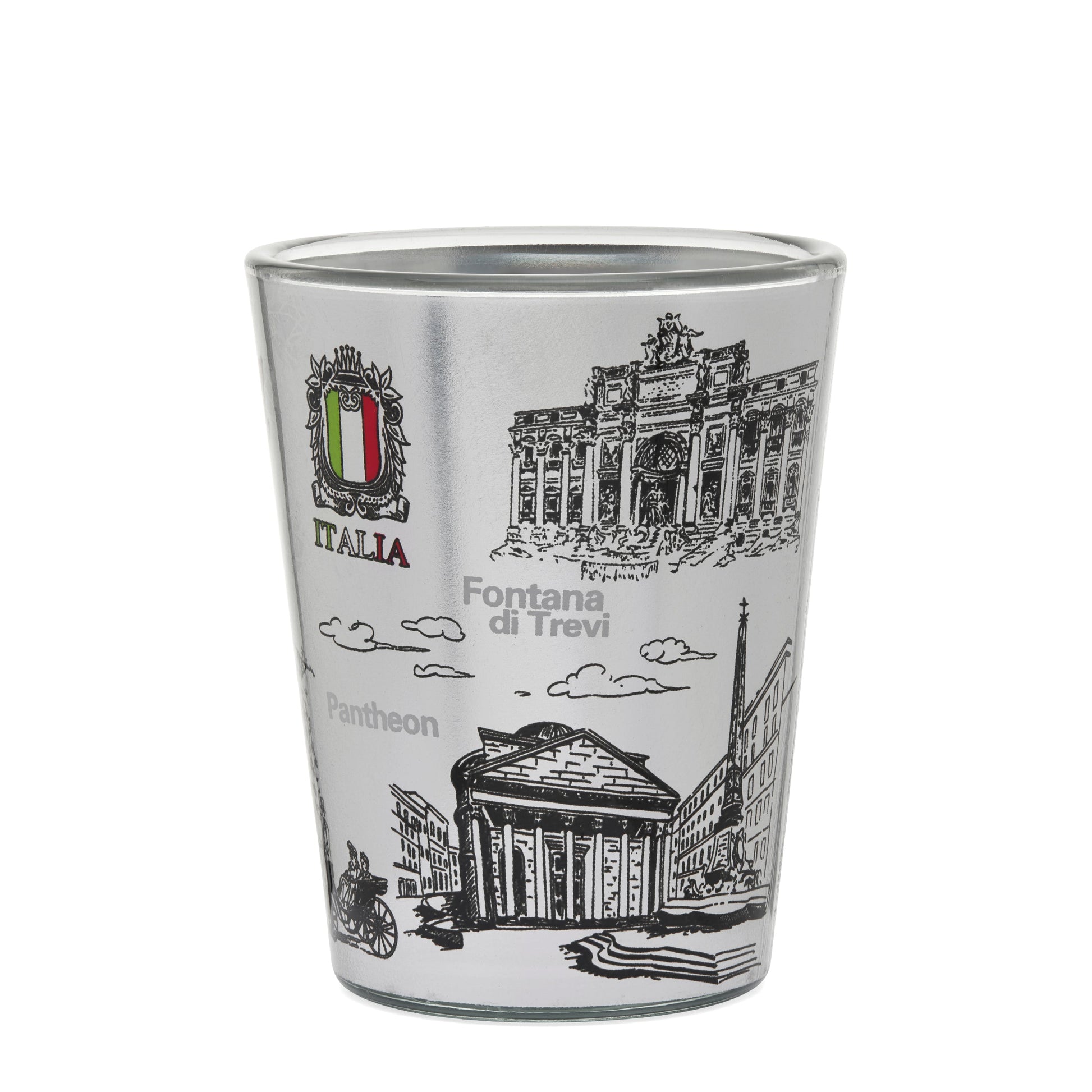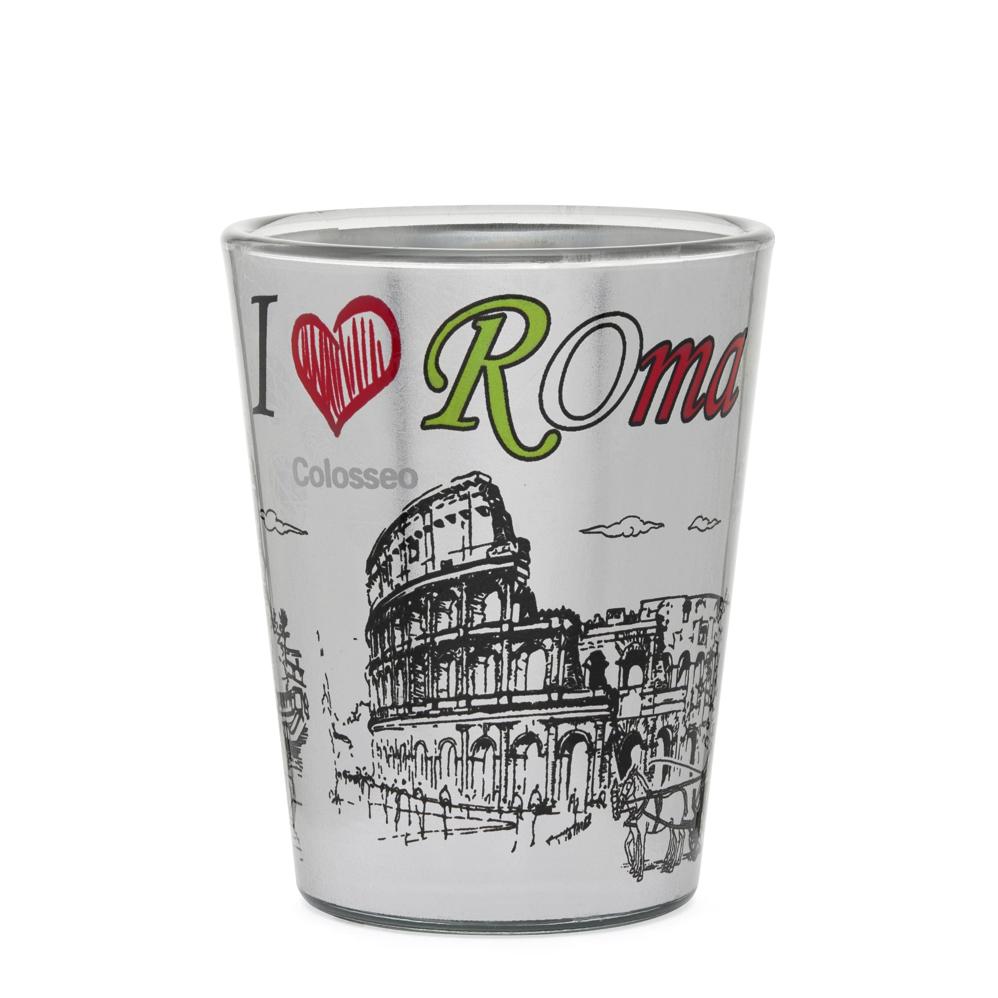 A white souvenir shot glass featuring Rome's iconic monuments in a charming hand-drawn, comic-style design. The clean white background beautifully enhances the artistic illustrations, making it a perfect keepsake or gift that captures the spirit of the Eternal City.