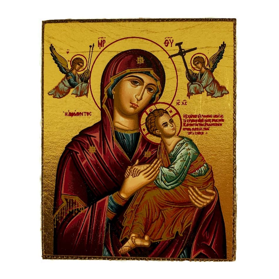Icon depicting the Madonna of Perpetual Help in wood and hand-finished with beeswax. The Madonna of Perpetual Help is a beloved 17th century icon, so its presence in this piece is sure to bring joy and peace to your home. This can also be used as a magnet.