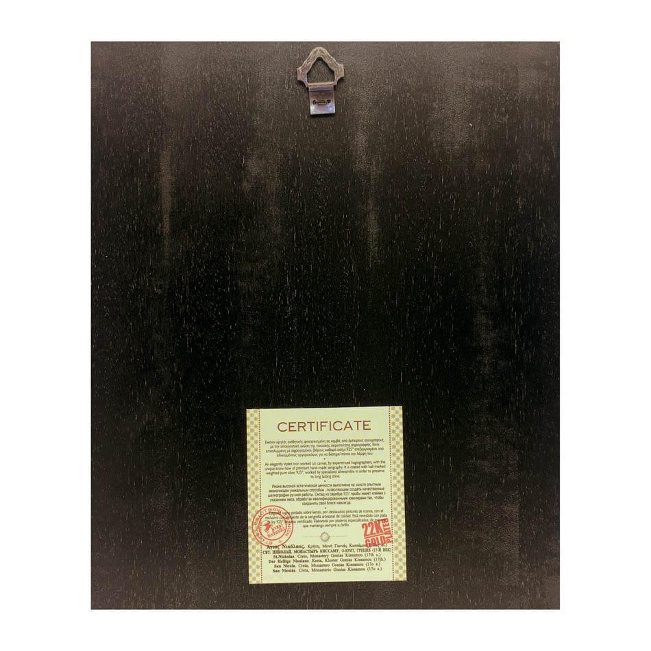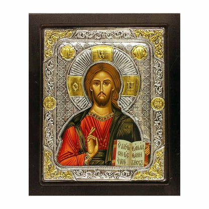 Icon depicting Jesus Christ in colored Silver on a wooden base. Wall installation and with support base. This iconic work of art is crafted from long-lasting, exquisite materials. The wall installation and support base make it easy to display this stunning depiction of Jesus Christ in your home.