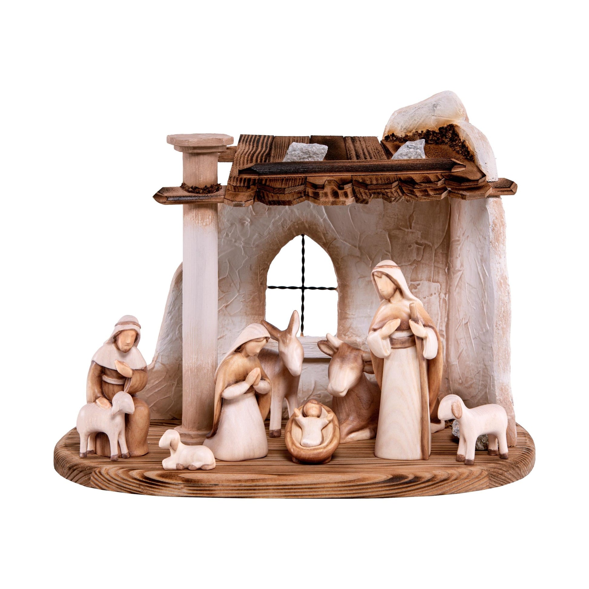 This nativity set beautifully blends modern design with the traditional aura of the Christmas story. It features movable figures, including Mary, Joseph, baby Jesus, the ox, donkey, and a shepherd. The contemporary style of the characters, crafted from high-quality wood, offers a fresh and elegant interpretation of the classic nativity scene. For any information regarding dimensions, you can contact customer service via chat.