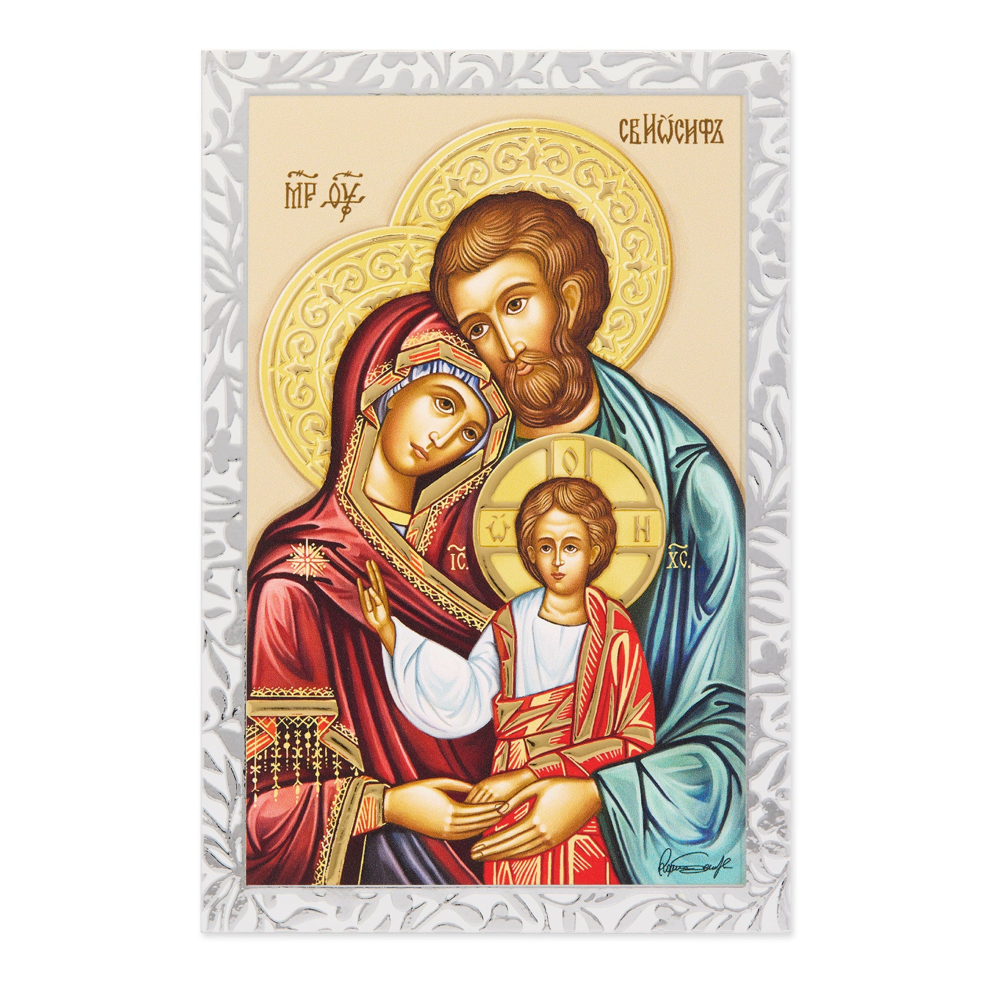 Lightweight wooden panel featuring a tender depiction of the Holy Family, a symbol of love, unity, and protection. The image conveys a deep sense of peace and spirituality, and is framed by an elegant decorative border enriched with sterling silver details, adding brightness and refinement to the piece. The panel can be hung on the wall or placed on a surface, making it a harmonious addition to any space in the home.