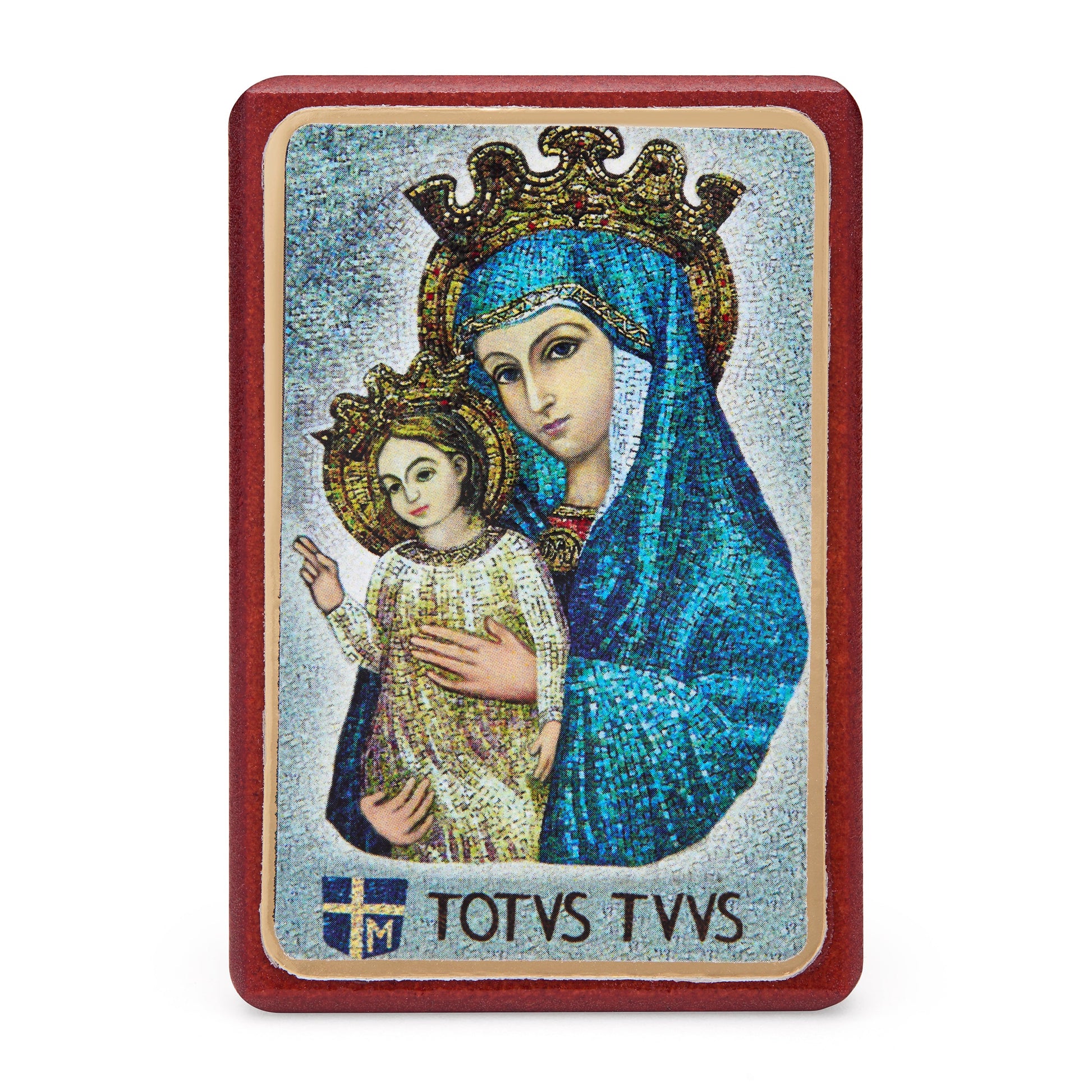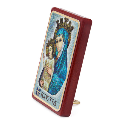 A wooden frame featuring a depiction of Mater Ecclesiae (Mother of the Church). The image portrays the Virgin Mary as a loving and protective figure, crowned and holding the Child Jesus, symbolizing her role as the spiritual mother of all Christians and her guidance over the Church. Designed for tabletop display, it can also be displayed on a wall. This piece embodies devotion to Mary as Mater Ecclesiae and serves as a meaningful addition to any sacred space or a thoughtful gift for moments of spiritual reflection.