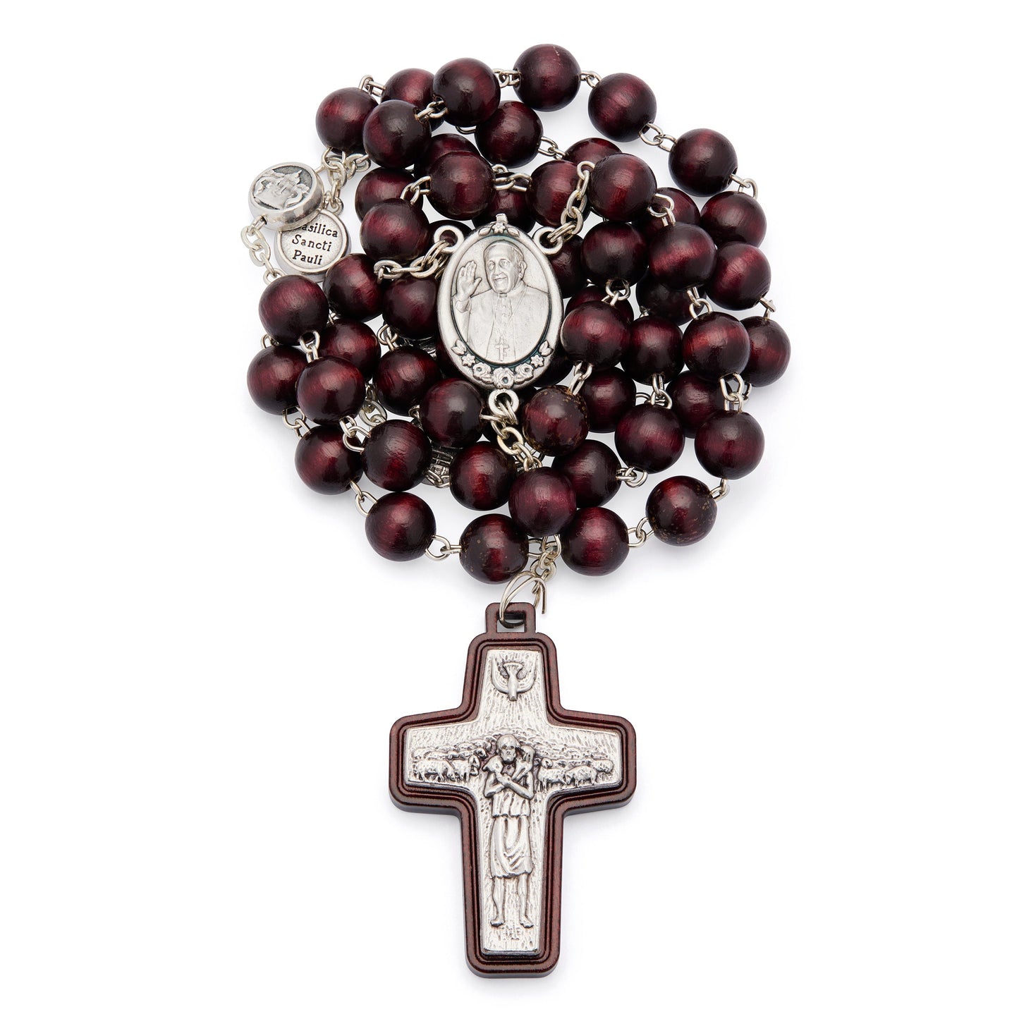 Wooden rosary, the centerpiece is with Pope Francis, Our Father beads with the Four Basilicas, Good Shepherd Cross.