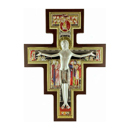 Cross of Saint Damiano in sterling on wood. The St. Damiano crucifix is one of the most venerated Crucifix in all the world. It is said that in 1206 this crucifix was probably hanging above the Altar of the abandoned Chapel of St Damiano. It was there, that a young man, Francesco Bernardone, Francesco of Assisi, entered and heard the voice of God commanding him "to rebuild my church." This beautiful crucifix is manufactured in Italy. Colored highlights accent the figure of Christ, standing up as a symbol of light.
