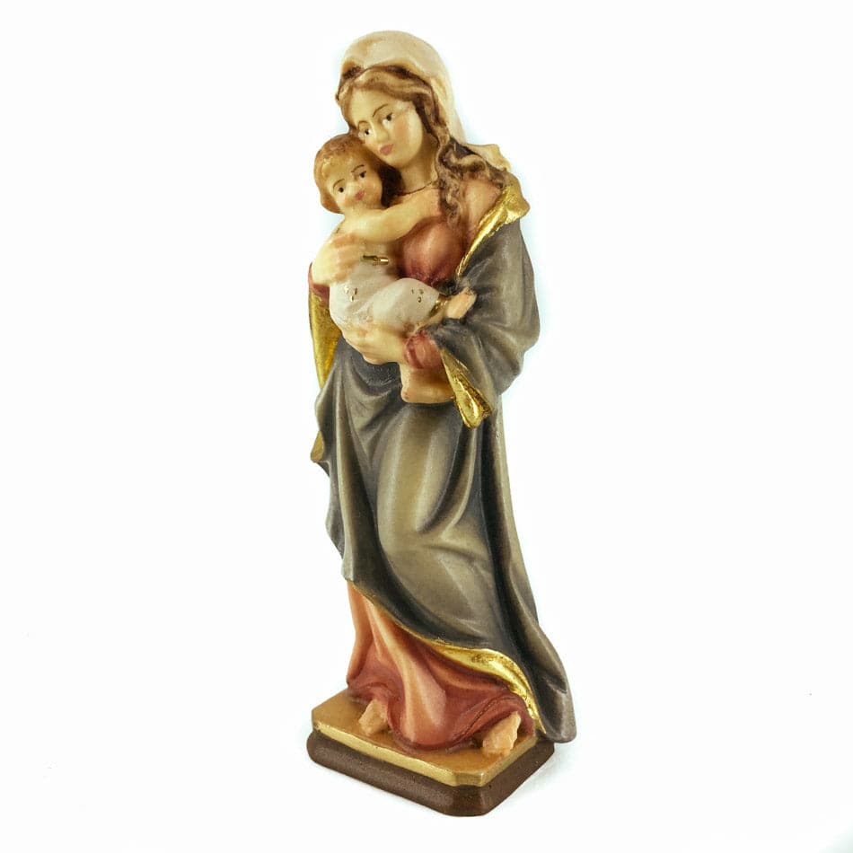 Wooden Virgin Mary Statue with Child. This amazing Sculpture depicts Mother Mary robed in her symbolic colours: red, blue and white. Red colour, usually worn by Jesus  as testimony of His Divine Presence among Humankind, reminds us She Gave Birth to the Son of God. Blue Colour symbolizes Mary's Assumption, White Colour remembers us Her Virginity.