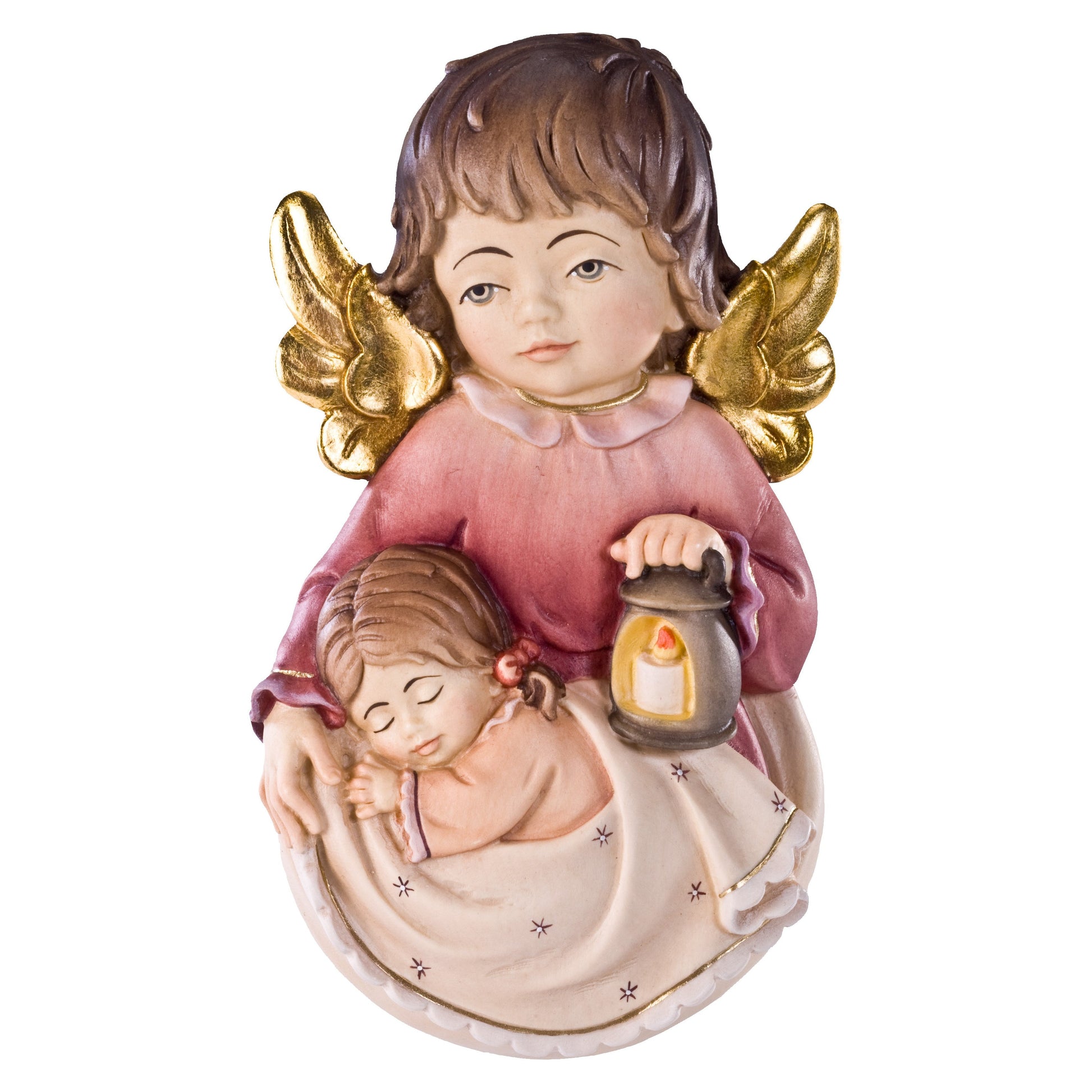 Wooden statue of Guardian angel to hang with girl. Crafted entirely by hand in Val Gardena, this splendid statue comes from the Alpine territory of Alto Adige, positioned at the northernmost part of the Italian peninsula, bordering Austria.