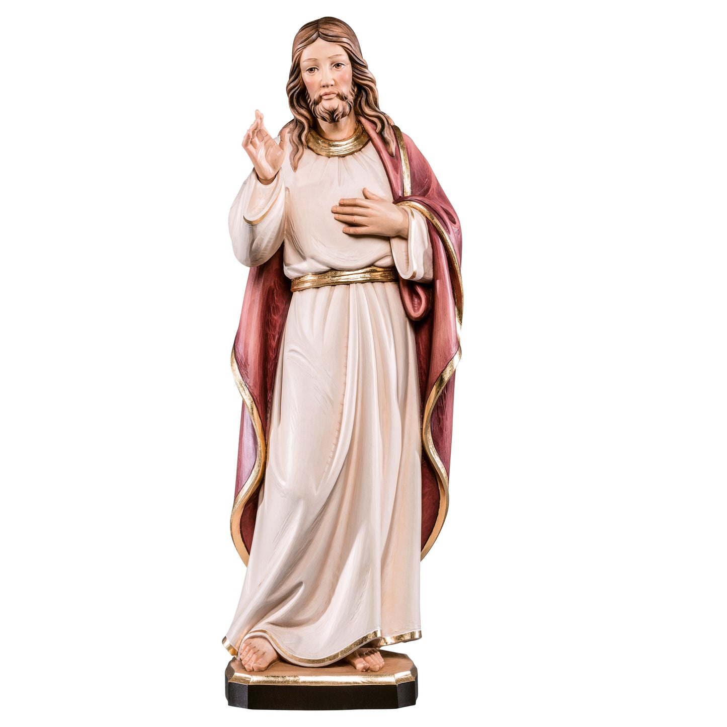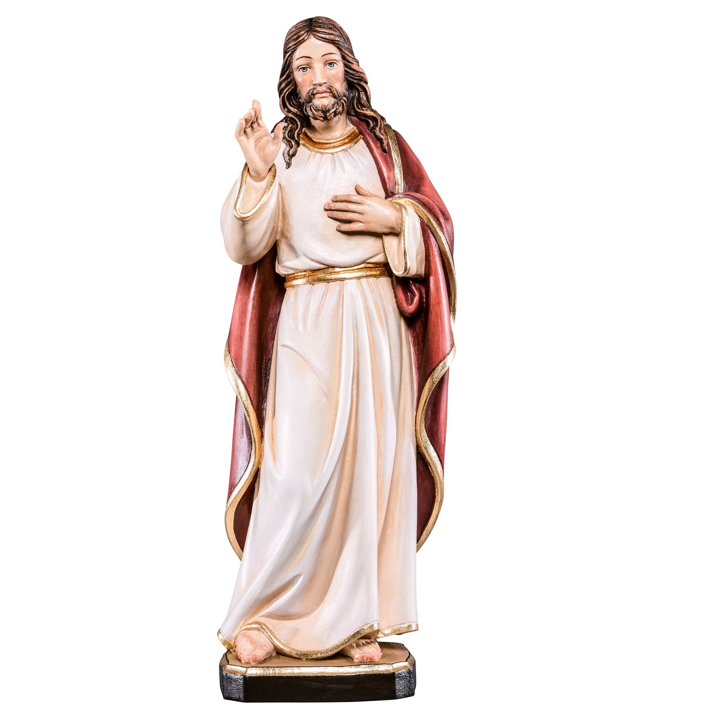 Wooden Statue of Jesus Classic Style. Crafted entirely by hand in Val Gardena, this splendid statue comes from the Alpine territory of Alto Adige, positioned at the northernmost part of the Italian peninsula, bordering Austria.