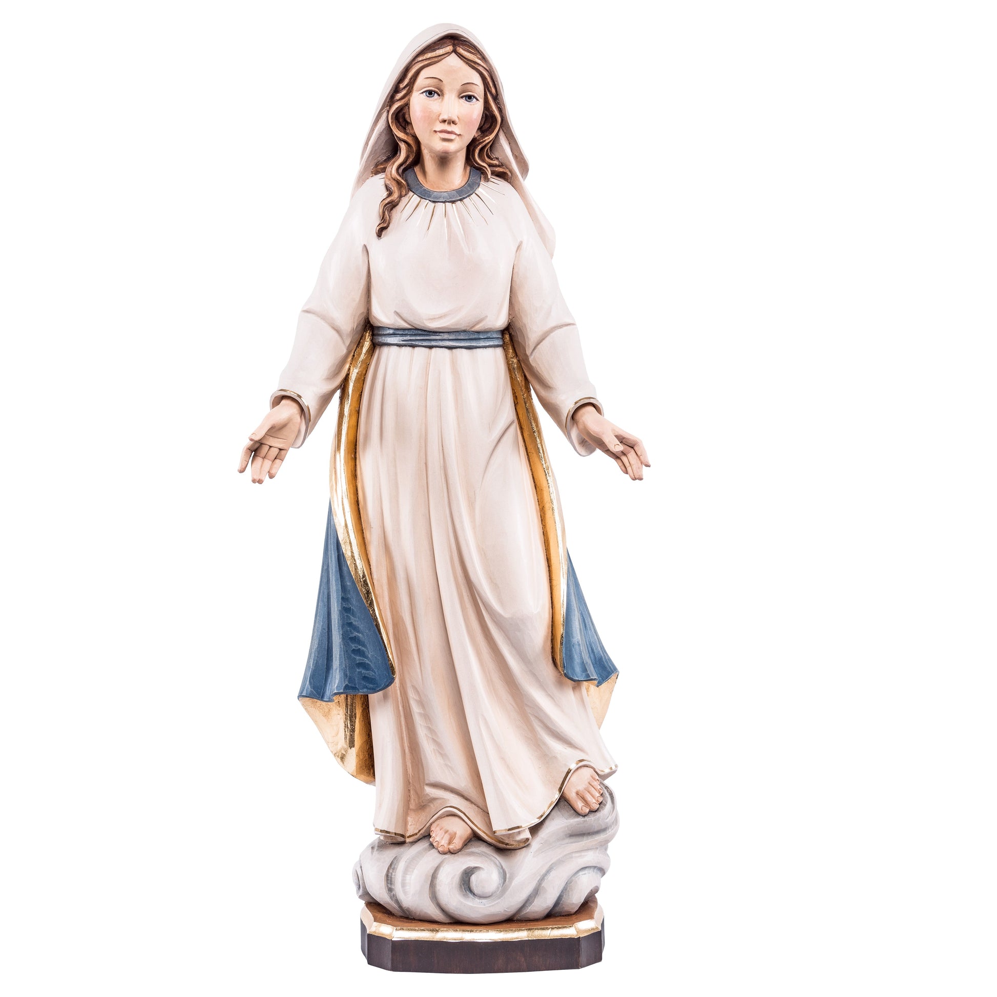 Wooden statue of Our Lady of Grace. Crafted entirely by hand in Val Gardena, this exquisite statue originates from the Alpine region of Alto Adige, nestled at the northernmost tip of the Italian peninsula, adjacent to Austria.