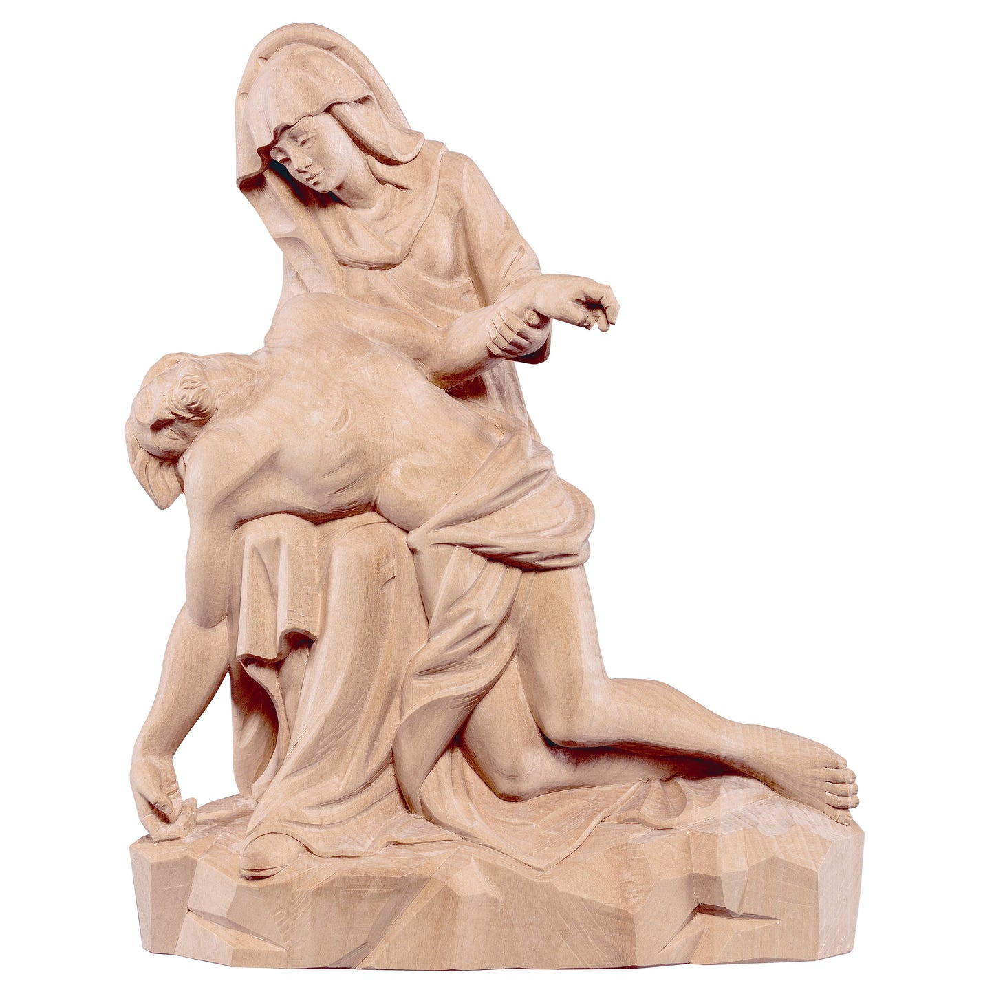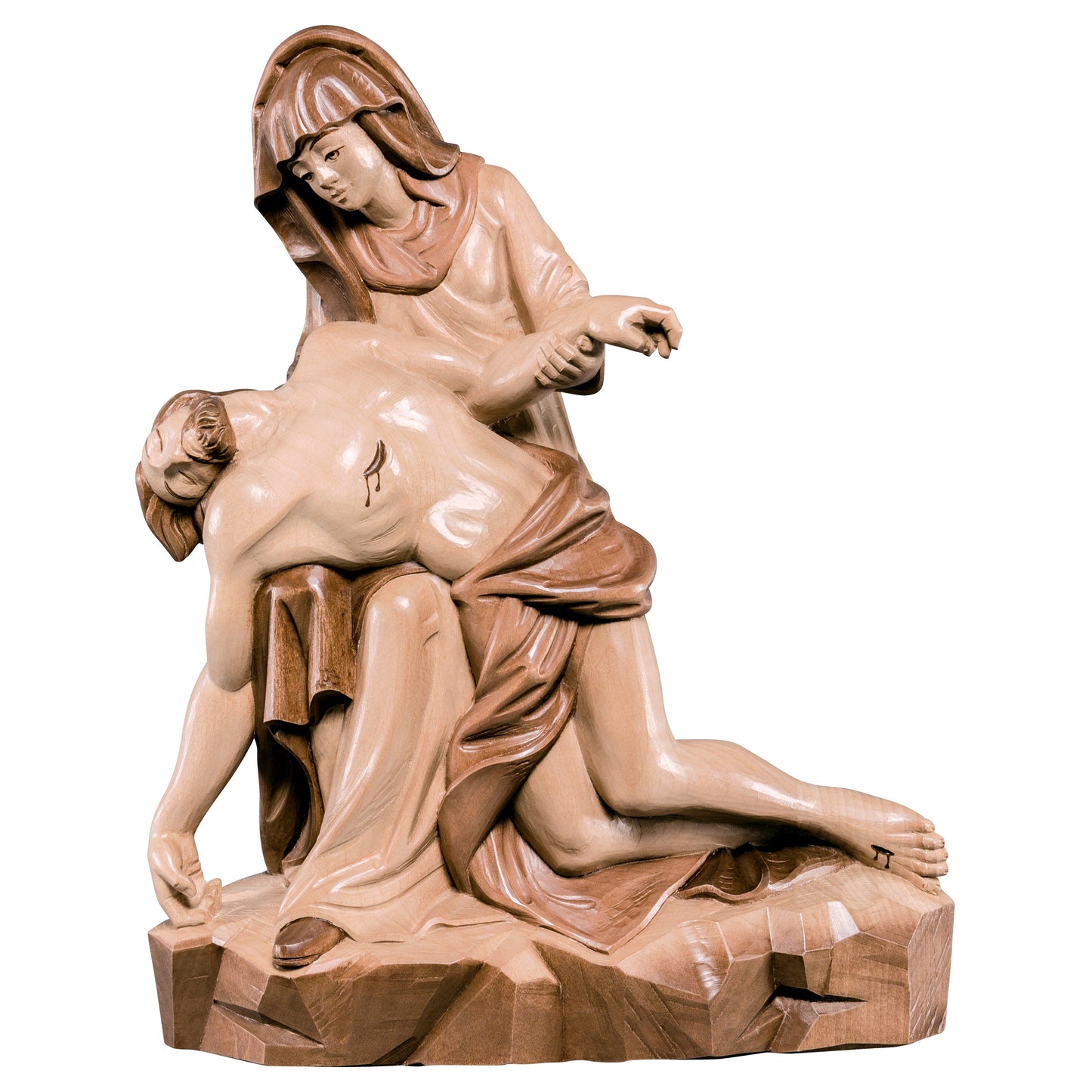 Wooden statue of Pietà. Crafted entirely by hand in Val Gardena, this exquisite statue originates from the Alpine region of Alto Adige, nestled at the northernmost tip of the Italian peninsula, adjacent to Austria.