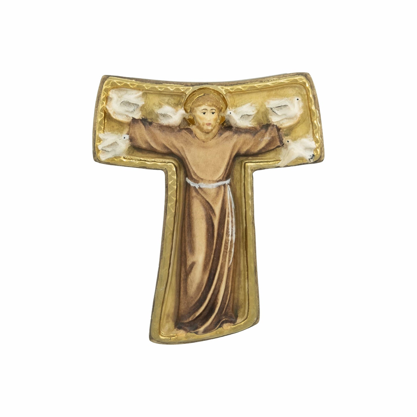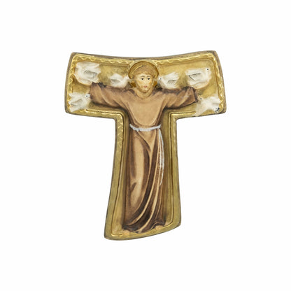 Wooden Tau Cross hand painted by Italian Master Craftsmen depicting Saint Francis of Assisi. A beautiful and unique piece of handcrafted art created by expert Italian Master Craftsmen. This cross is a testament to the skill and expertise of these artisans, and a tribute to the legacy of Saint Francis of Assisi.