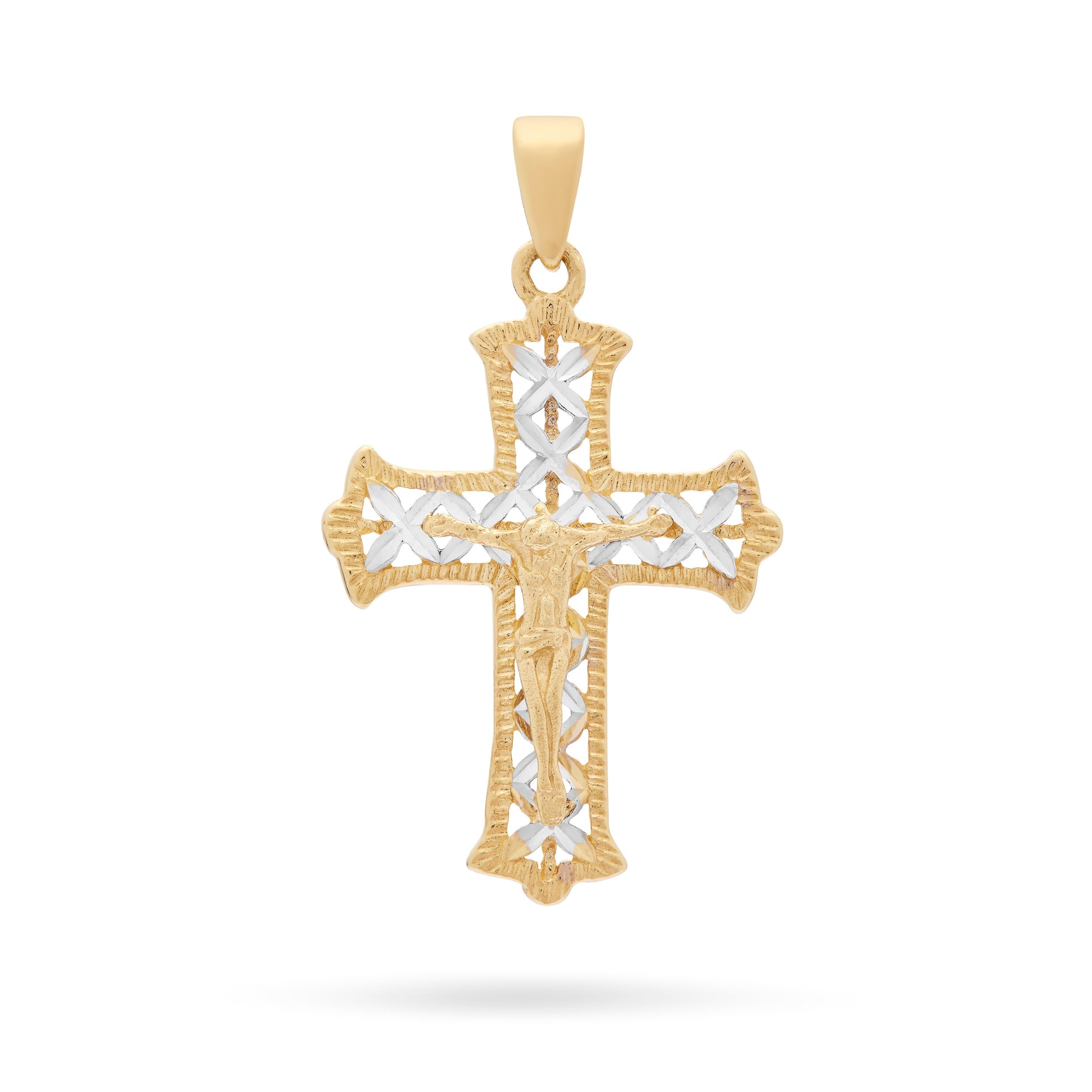 Enhance your style with our eye-catching 18kt yellow gold crucifix pendant, adorned with interwoven white gold details, also perfect for gift giving. A symbol of elegance and faith, this pendant beautifully weaves traditional craftsmanship with modern aesthetics. A timeless piece suitable for any occasion.