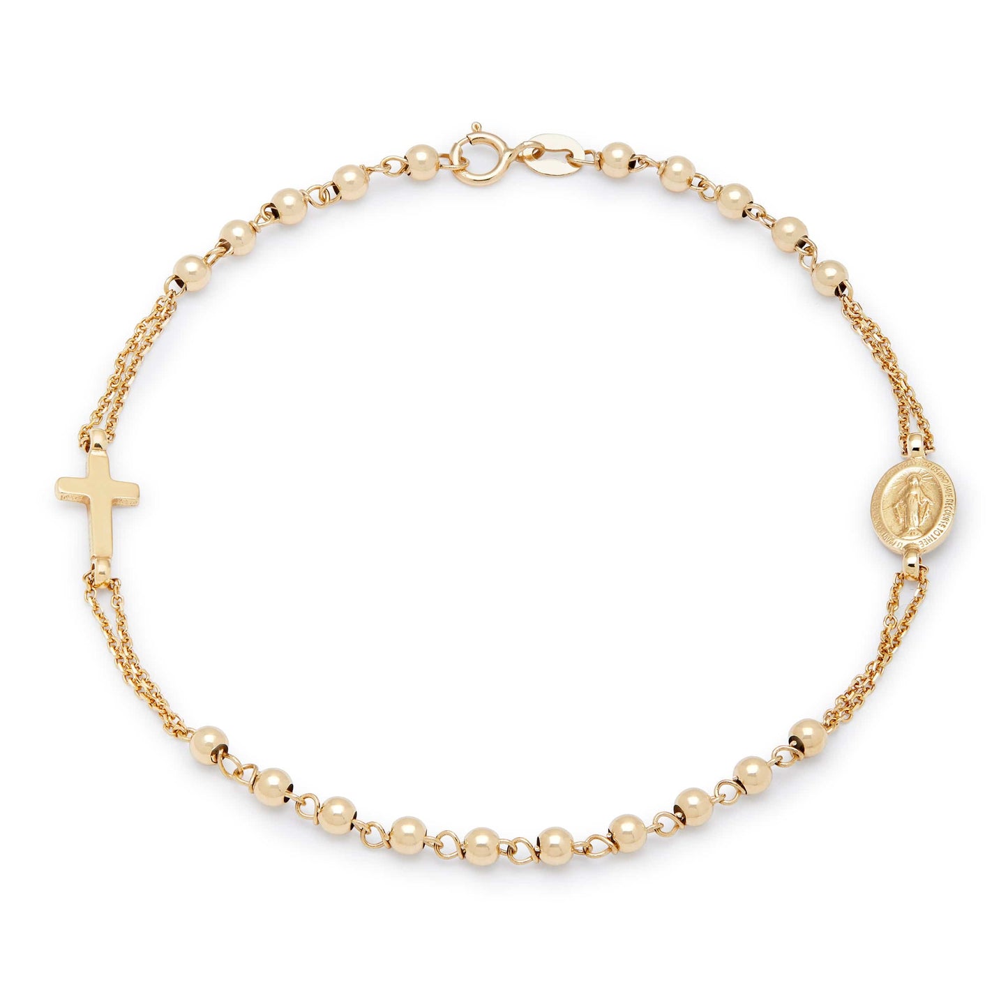 Yellow 18kt gold bracelet with 2 mm smooth beads. Mounted on the chain, a small cross and a Miraculous Mary medal.